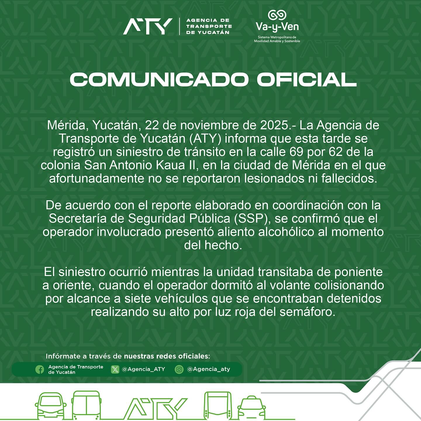 La Agencia de Transporte de Yucatán (ATY) informó sobre un siniestro de tránsito ocurrido la tarde de este sábado en la calle 69 por 62 de la colonia San Antonio Kaua II, donde un operador impactó por alcance a siete vehículos detenidos en un semáforo.
