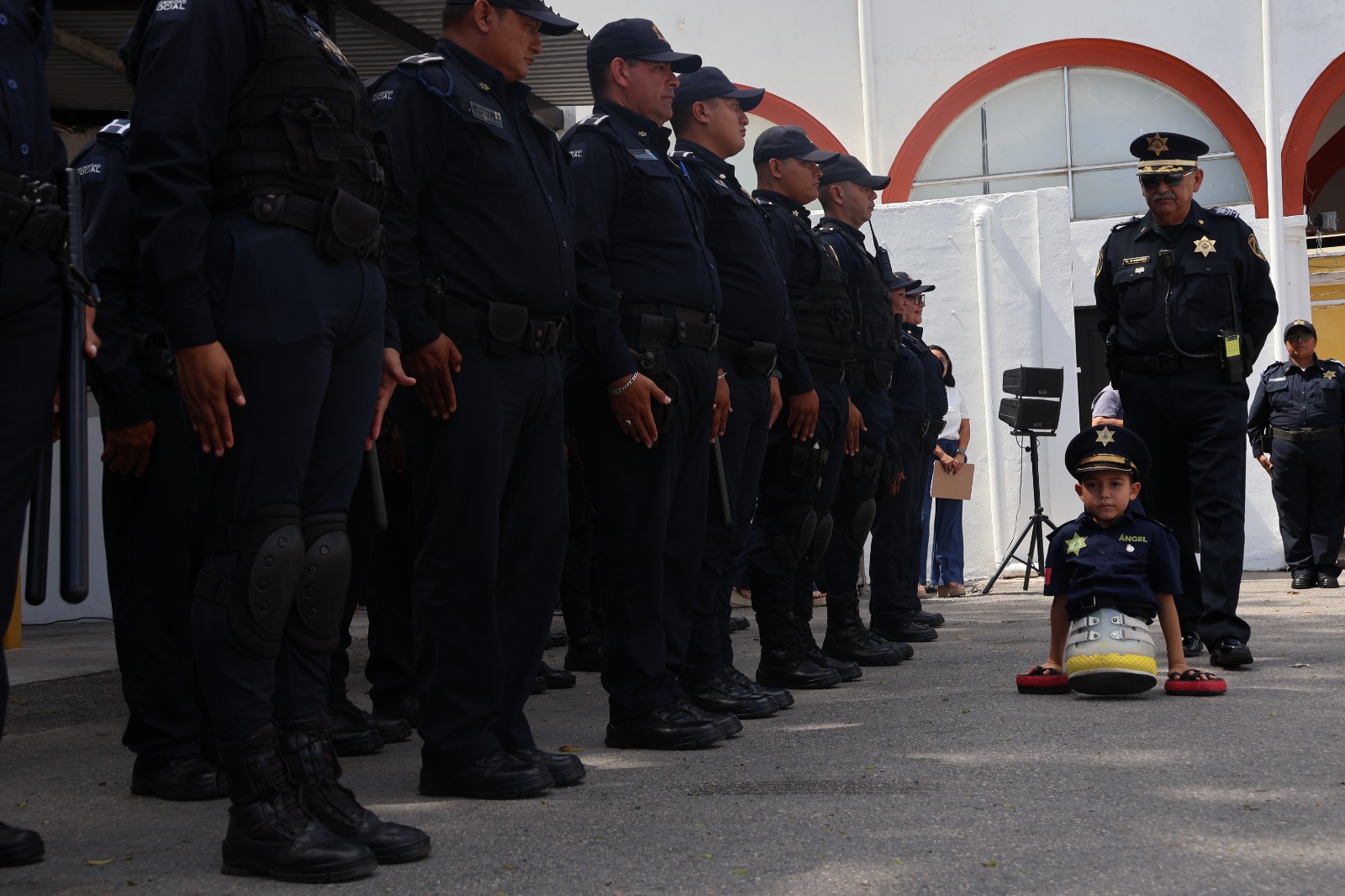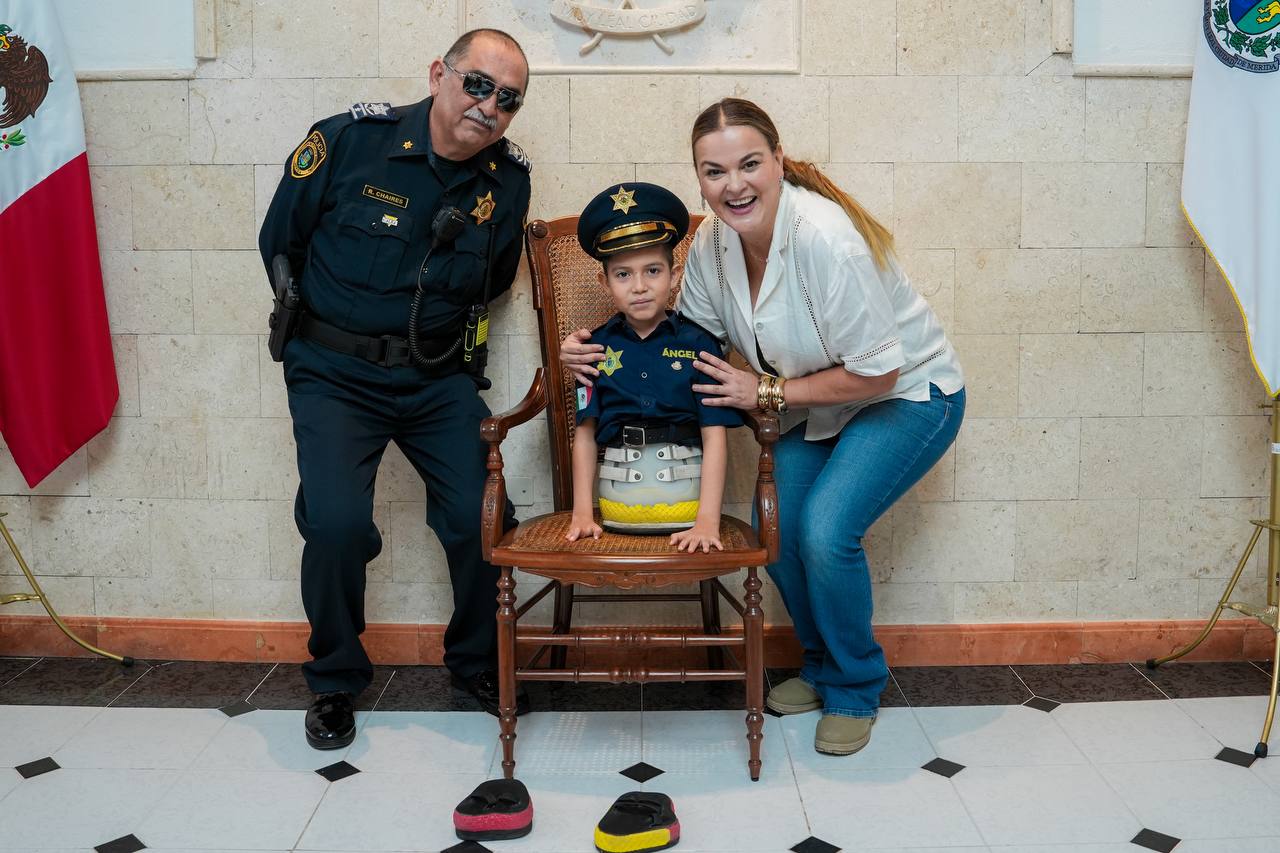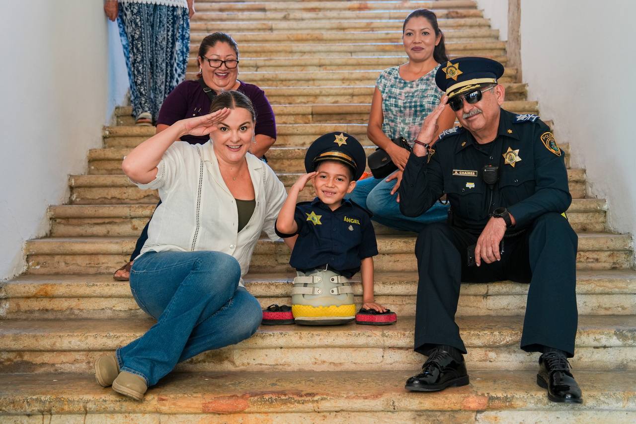 Acompañado de su madre, Aidee Chan Pool, Ángel fue trasladado en una patrulla hasta las instalaciones de la corporación, donde participó en una ceremonia cívica, rindió honores a la bandera y presenció el pase de lista del personal operativo.