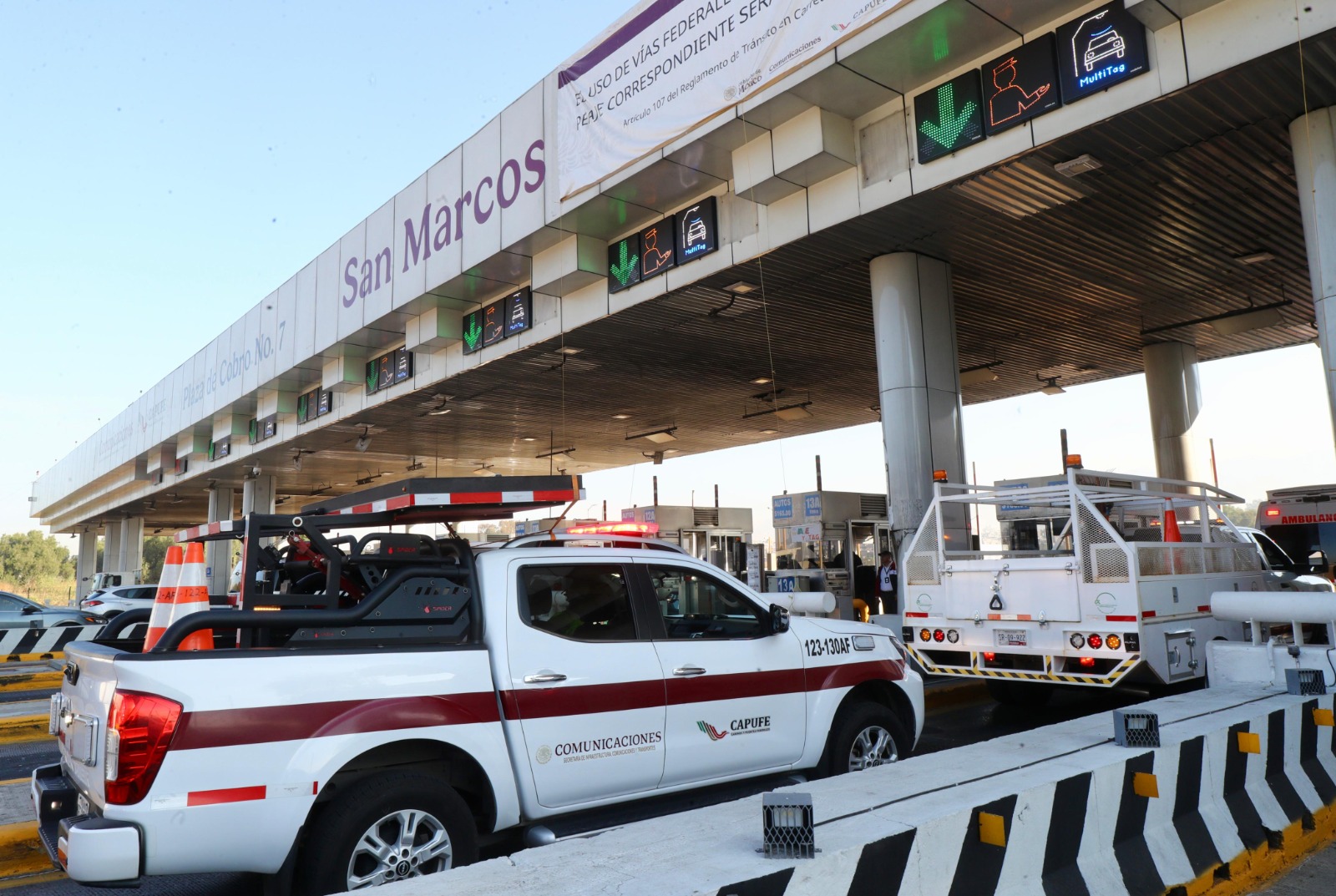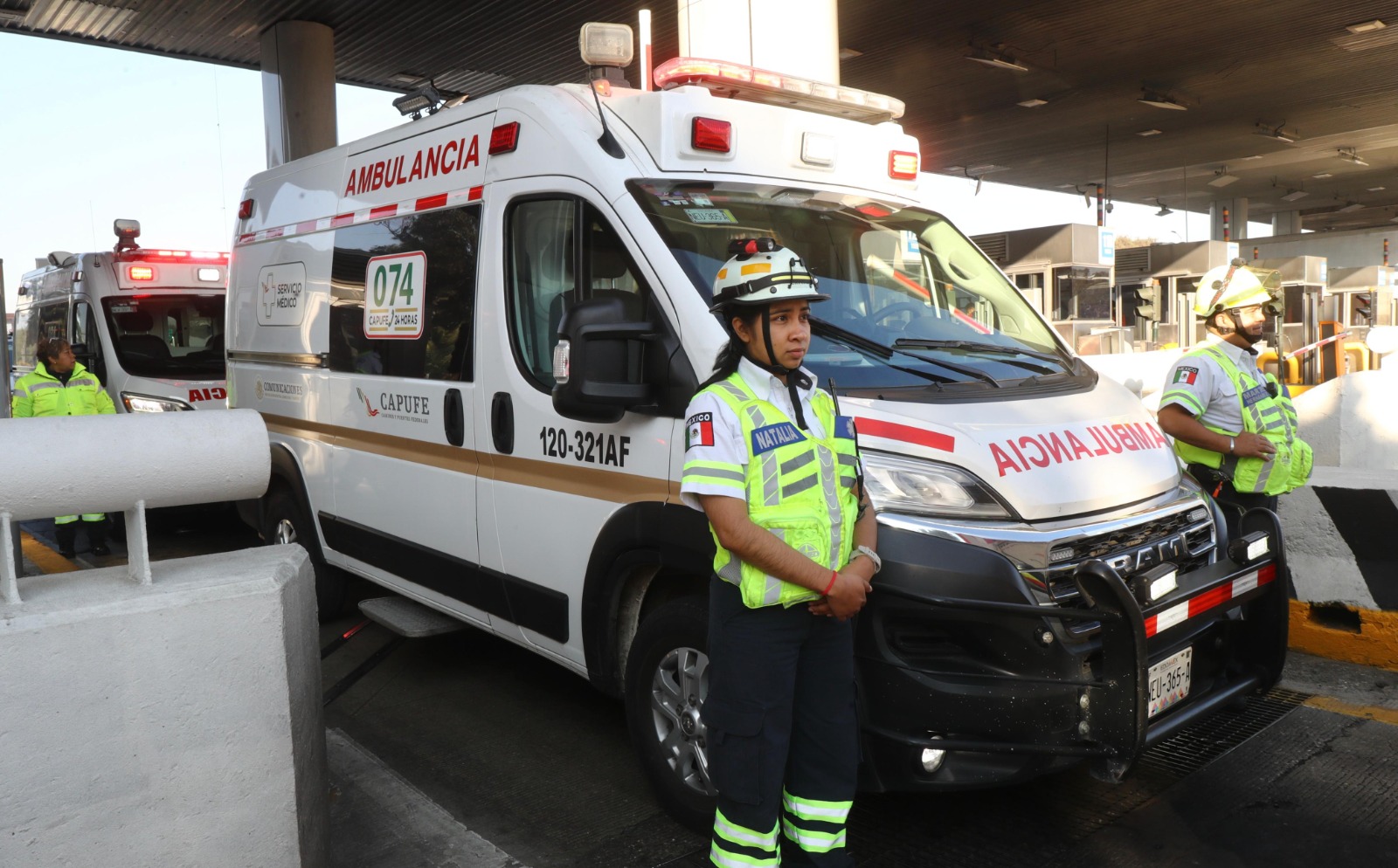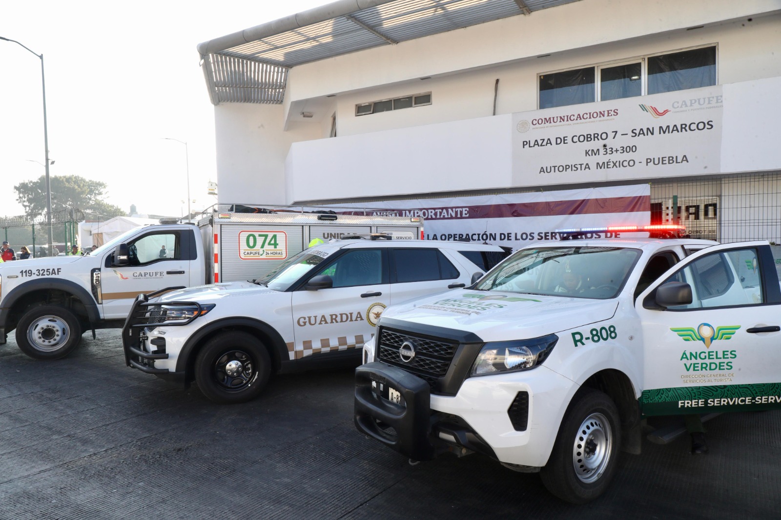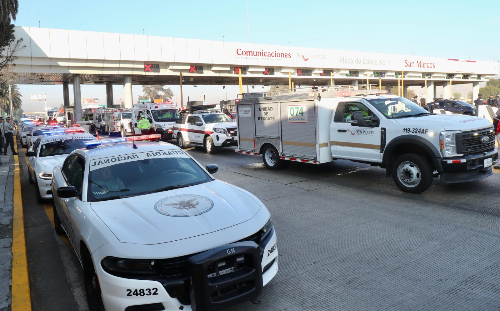 Durante el acto realizado en la Plaza de Cobro San Marcos, se informó que el operativo contempla la participación de más de 4 mil 800 personas, entre personal médico, operadores de grúas, cajeras y cajeros, así como el despliegue de 254 vehículos de auxilio, entre ambulancias, grúas y unidades de rescate.