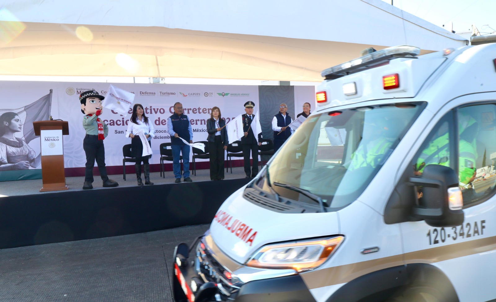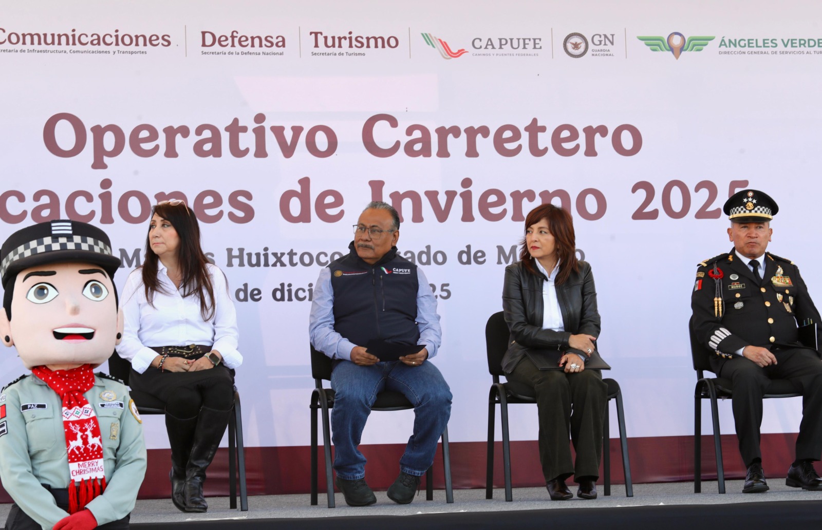 San Marcos Huixtoco, Estado de México, 18 de diciembre de 2025.– El Gobierno de México, a través de la Secretaría de Infraestructura, Comunicaciones y Transportes (SICT), en coordinación con Caminos y Puentes Federales (CAPUFE) y la Guardia Nacional, dio el banderazo simbólico de inicio al Operativo Carretero Vacaciones de Invierno 2025, que se desarrollará del viernes 19 de diciembre de 2025 al domingo 4 de enero de 2026.