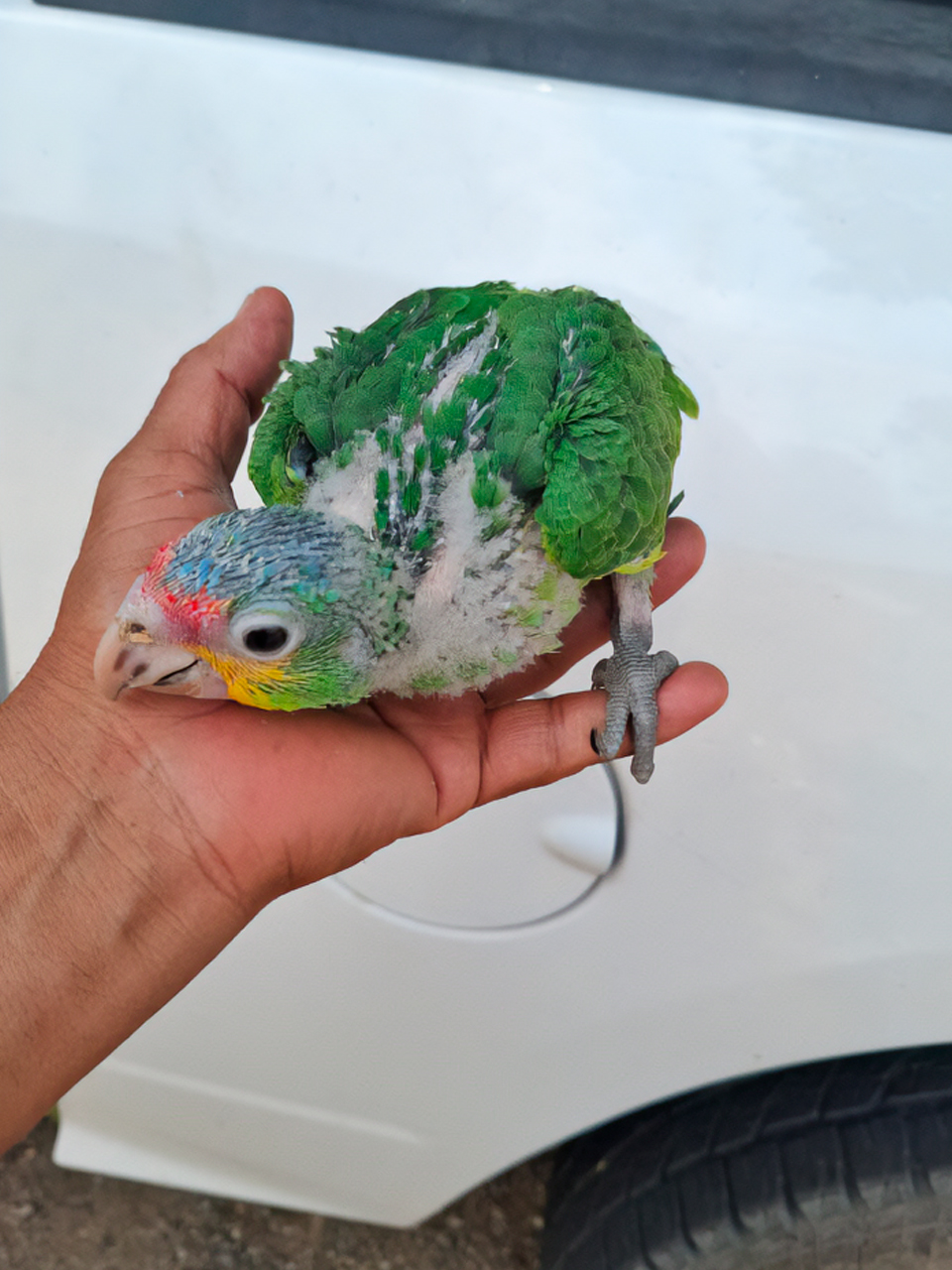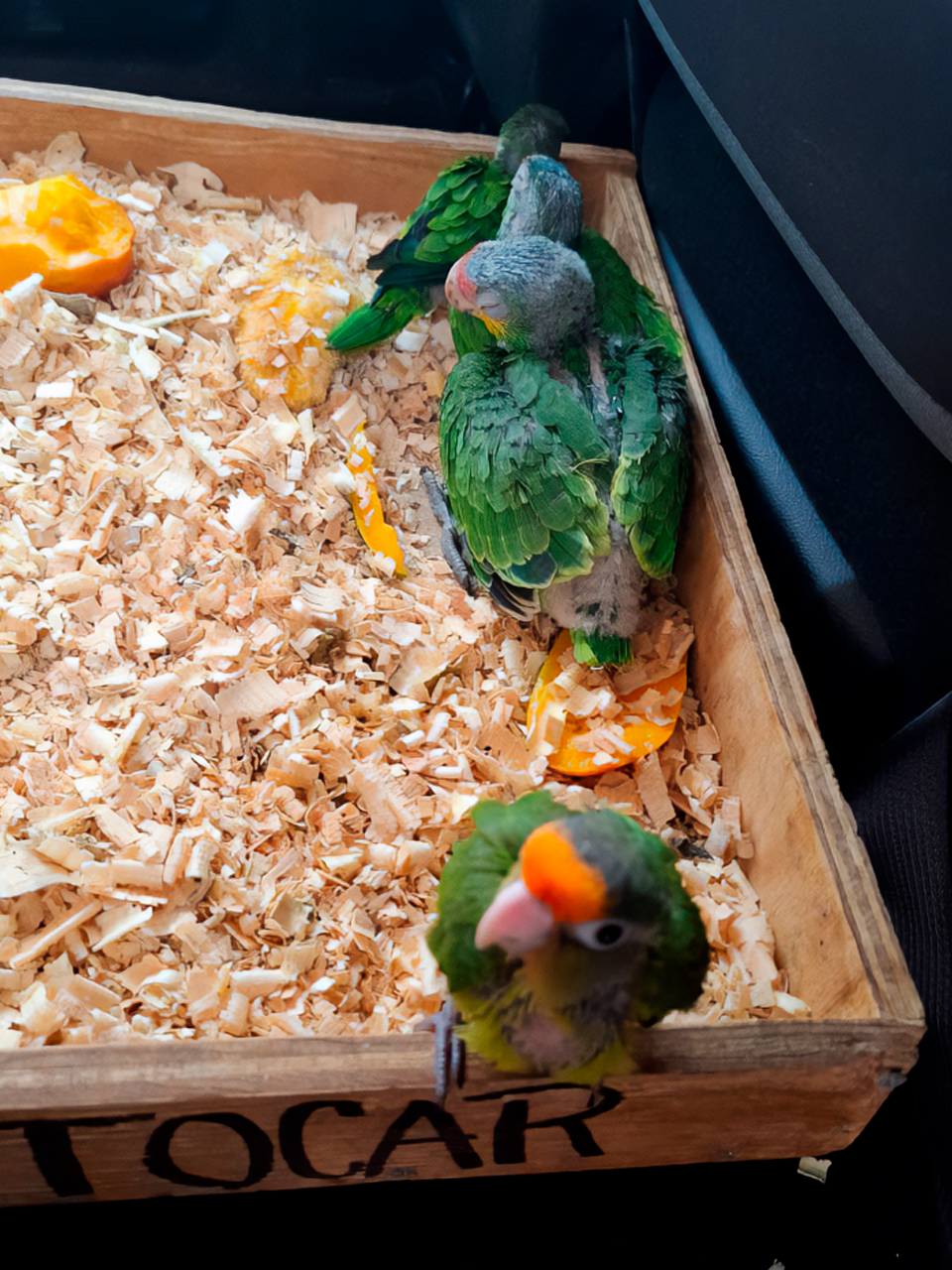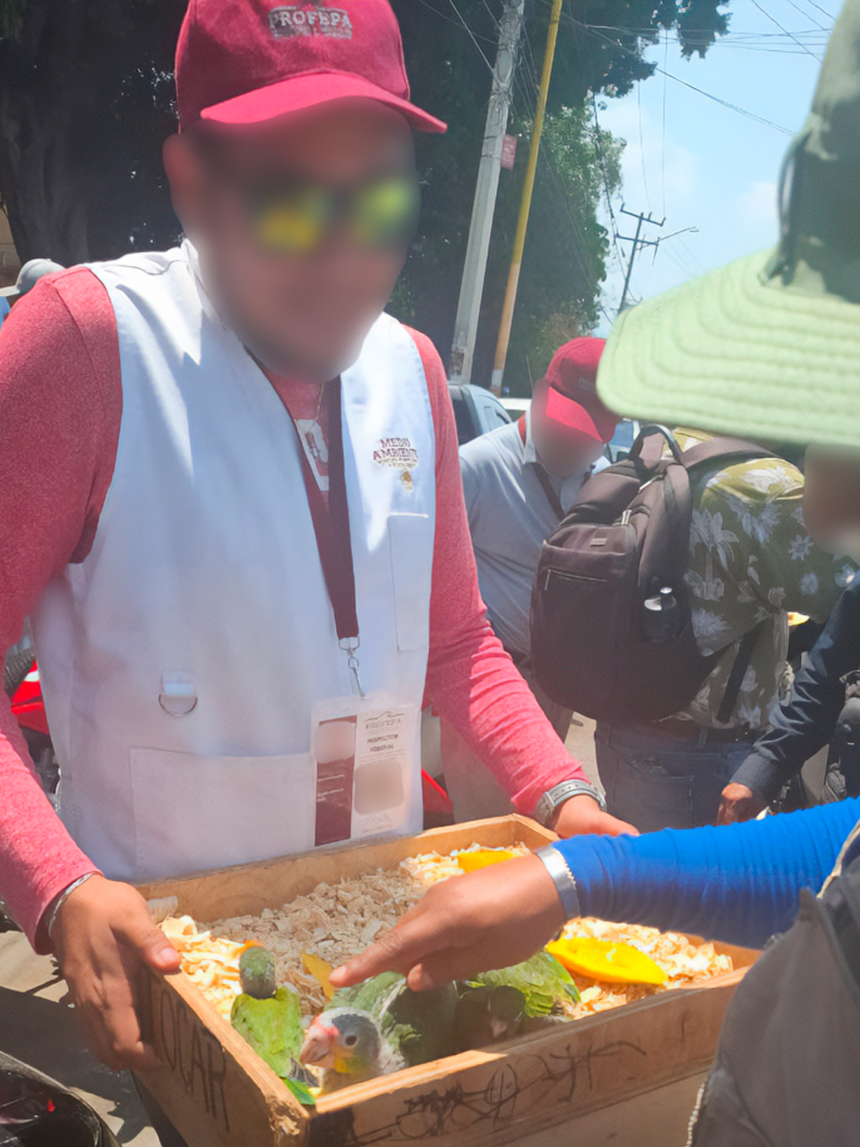 Posteriormente, en un recorrido por el llamado “pasillo de la miel” en el mercado de abastos, se detectó a una persona comercializando aves silvestres protegidas. Se aseguraron cuatro polluelos: un loro cachetes amarillos (Amazona autumnalis), un loro frente blanca (Amazona albifrons), un perico atolero o frente naranja (Eupsittula canicularis), y un perico pecho sucio (Eupsittula nana), todos listados en la NOM-059-SEMARNAT-2010 y el Apéndice II de la CITES.