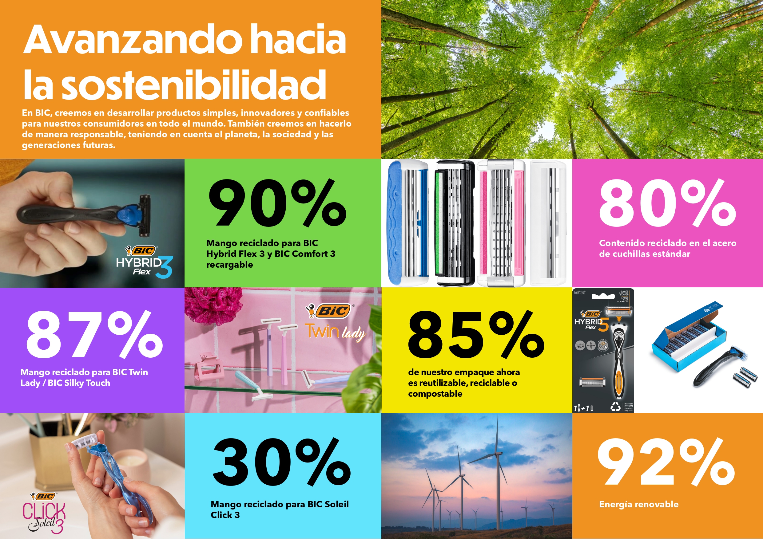 En materia de sostenibilidad, BIC avanza con fuerza bajo su filosofía de “hacer más con menos”, utilizando materiales reciclados en mangos y navajas, empaques reciclables o compostables y energía renovable en el 92 % de sus operaciones industriales.