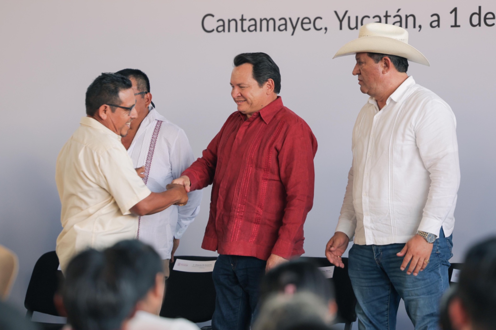 El programa Huertos de Traspatio también llegó a las familias de Cantamayec con tinacos, malla perimetral, sistemas de riego, semillas y acompañamiento técnico del ITA de Conkal, el Comité Estatal de Sanidad Vegetal y el CICY. El Gobernador exhortó a las y los beneficiarios a aprovechar los insumos y anunció que se impulsan sistemas de riego con paneles solares para garantizar agua durante todo el año sin depender de la CFE.