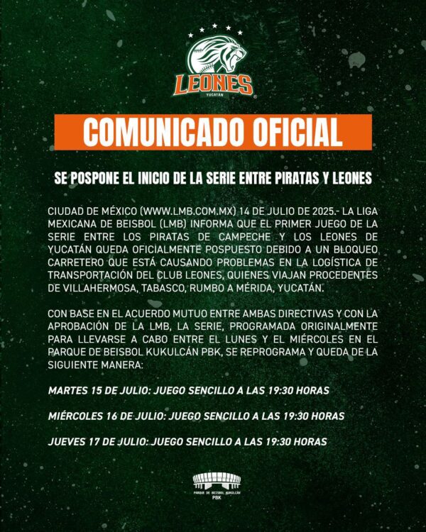 Mérida, Yucatán, 14 de julio de 2025.– La Liga Mexicana de Beisbol (LMB) informó que el primer juego de la serie entre los...