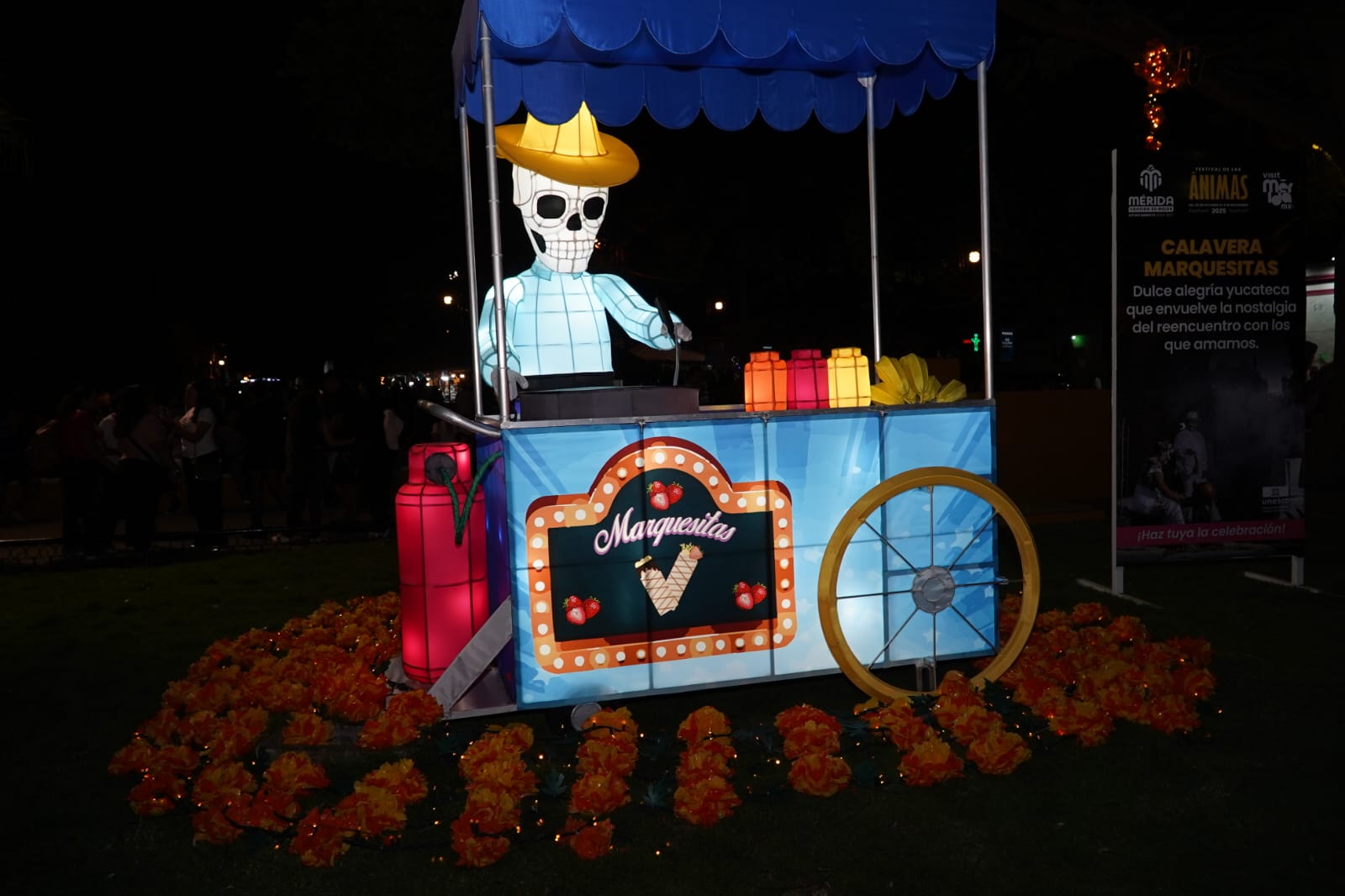 Las esculturas monumentales, inspiradas en catrinas, calaveras y oficios populares, rinden homenaje a la identidad cultural de Mérida y a los personajes que dan vida a las celebraciones del Día de Muertos.