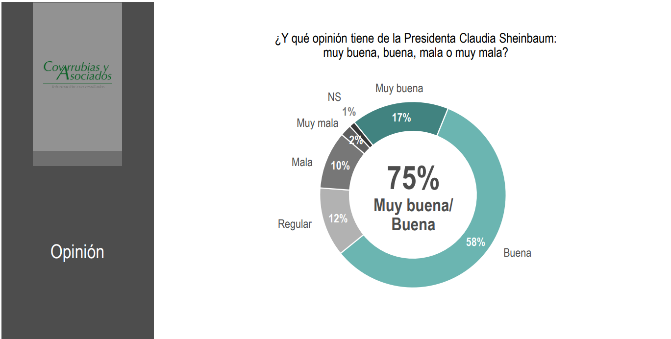 A punto de cumplir su primer año al frente del país, la Presidenta Claudia Sheinbaum registra un 72% de aprobación ciudadana, de acuerdo con la más reciente encuesta de Covarrubias y Asociados.