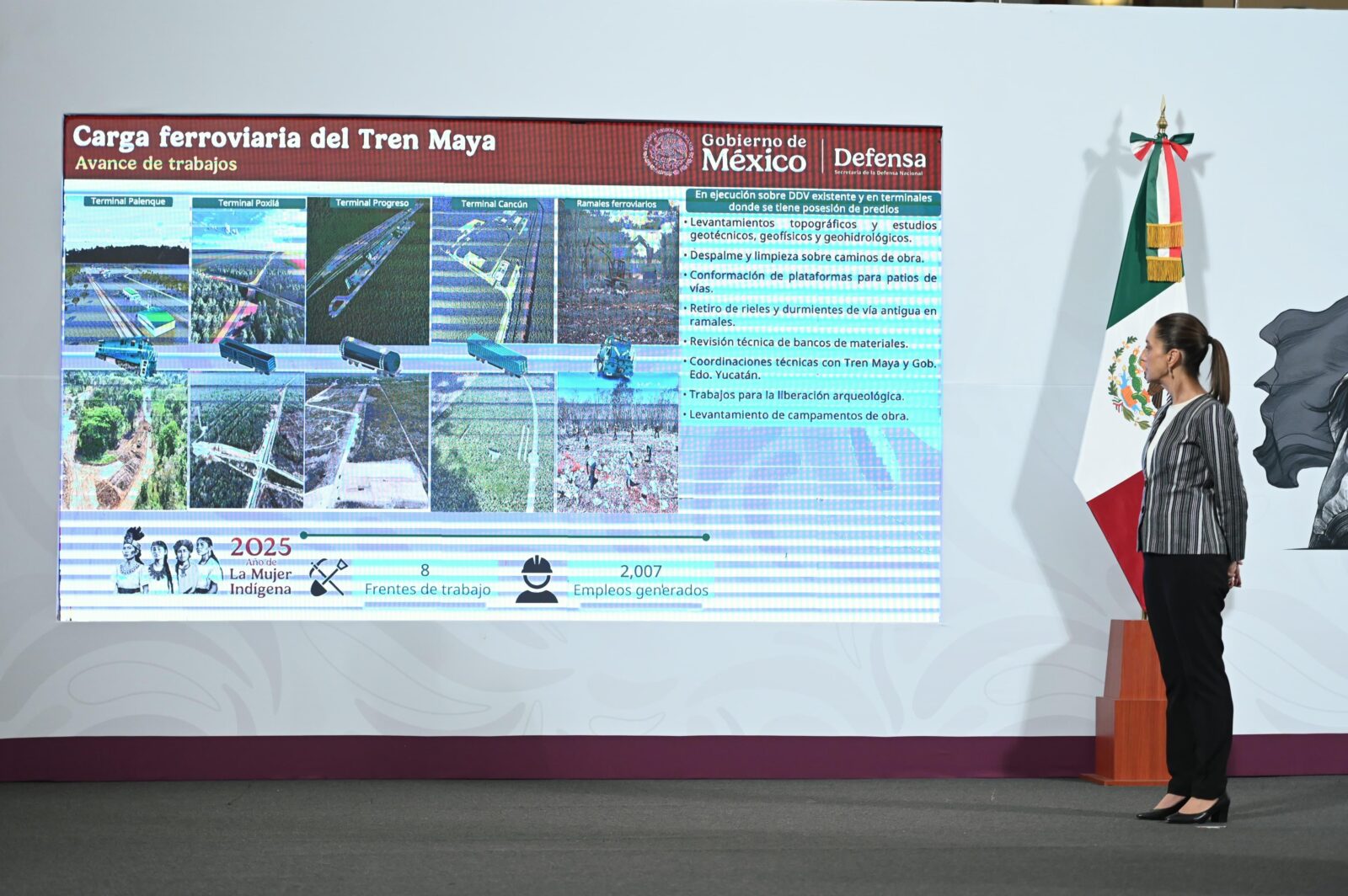 Asimismo, se construyen cuatro terminales multimodales para la vía de carga del Tren Maya, en Palenque, Poxilá, Progreso y Cancún. Estos trabajos se suman a la finalización de detalles del Tren Maya turístico, particularmente en zonas arqueológicas y catenarias.
