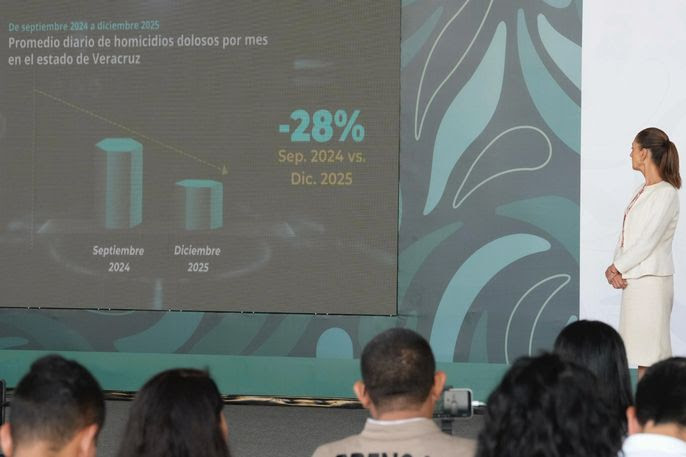 Veracruz, Veracruz de Ignacio de la Llave, 23 de enero de 2026.- La Presidenta Claudia Sheinbaum Pardo destacó que, en Veracruz, con la Estrategia Nacional de Seguridad y gracias a la coordinación que hay con la entidad, se redujo en 28 por ciento el homicidio doloso, entre septiembre de 2024 y diciembre de 2025, al pasar de 3.13 a 2.48 el promedio diario de víctimas de ese delito.