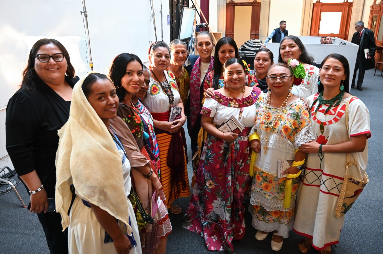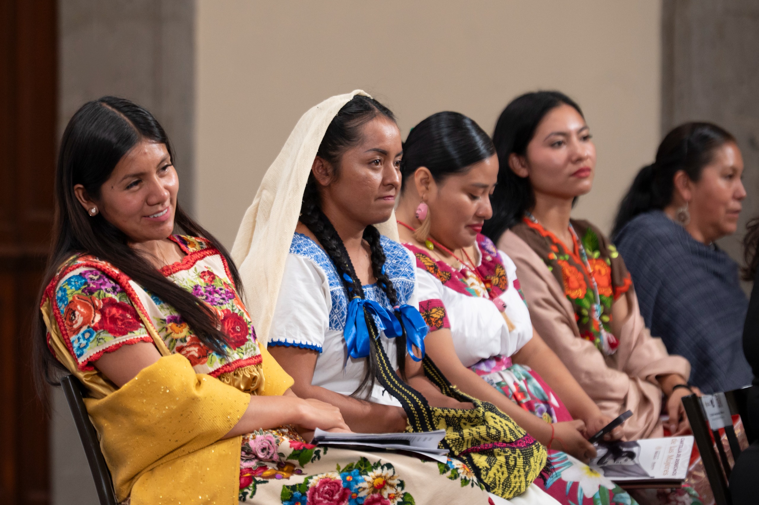Durante la presentación, mujeres indígenas como María del Carmen Álvarez, chichimeca guachichil, y otras representantes de lenguas originarias, leyeron la Cartilla de los Derechos de las Mujeres, traducida a 35 lenguas.