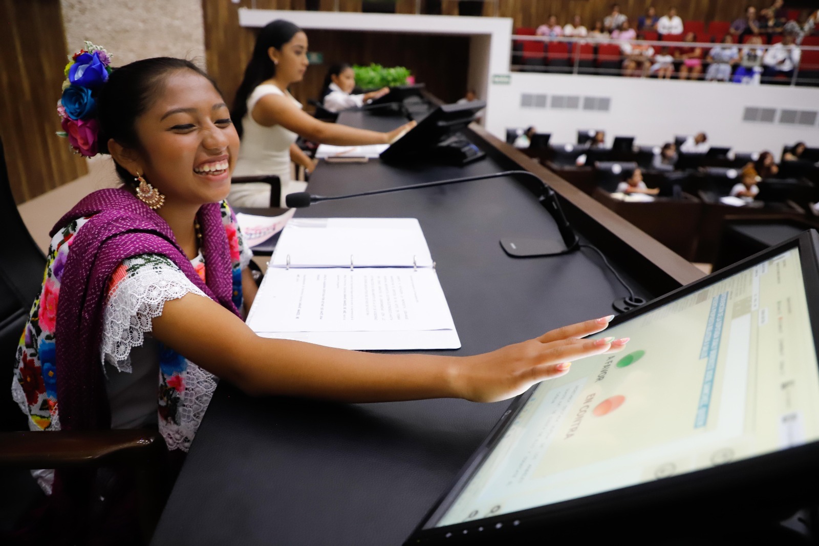En representación de las diputadas niñas, Bárbara Avril Tamayo Palma, de Sinanché, dirigió un emotivo mensaje ante el Pleno, destacando la importancia de escuchar la voz infantil en los temas públicos: