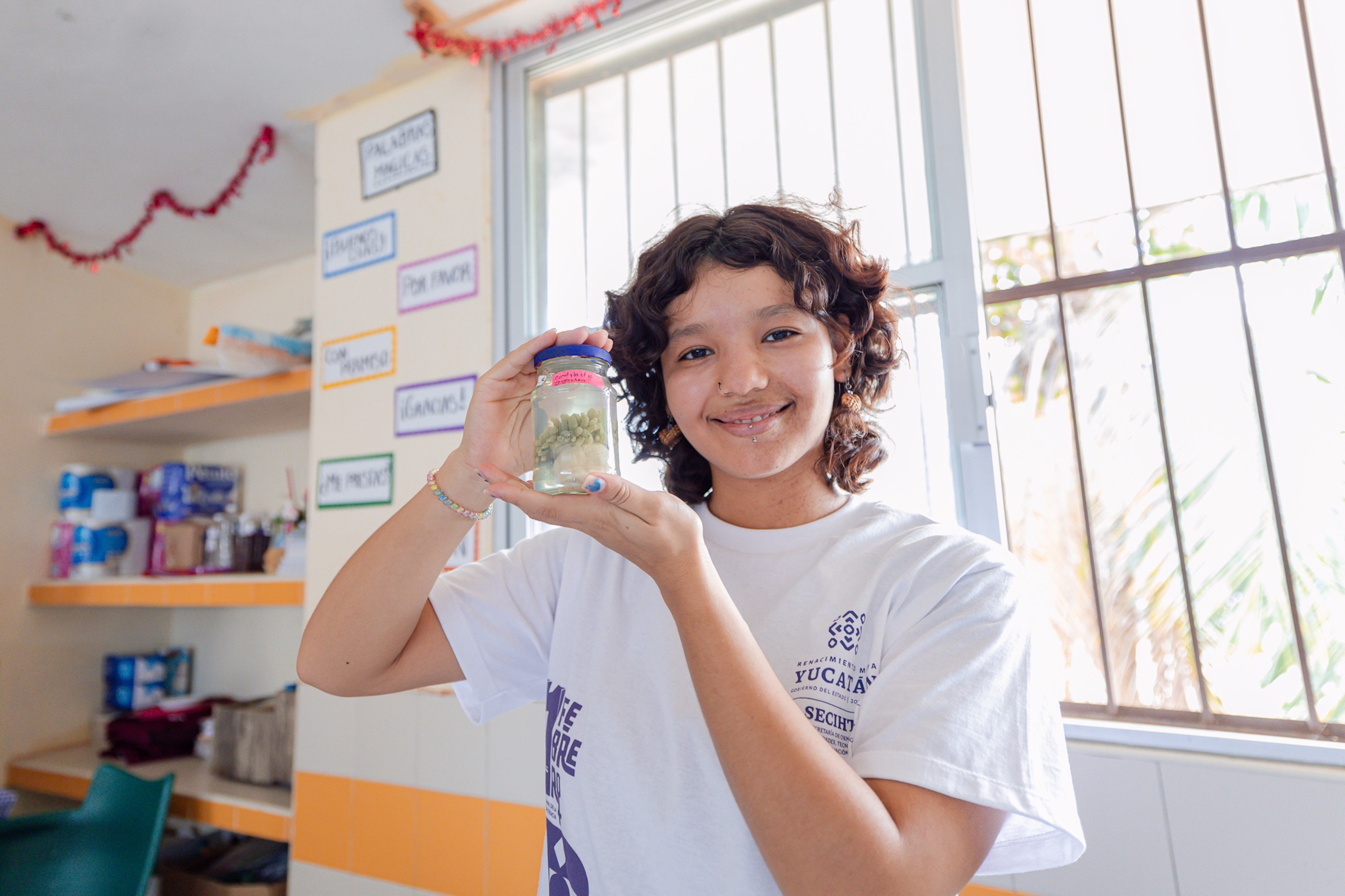 En esta comunidad destaca la participación de la alumna Ana Beatriz May May, quien ganó el concurso para diseñar la botarga oficial de la SECIHTI denominada “K’awiil k’in”, un tolok científico que acompañó las actividades educativas.