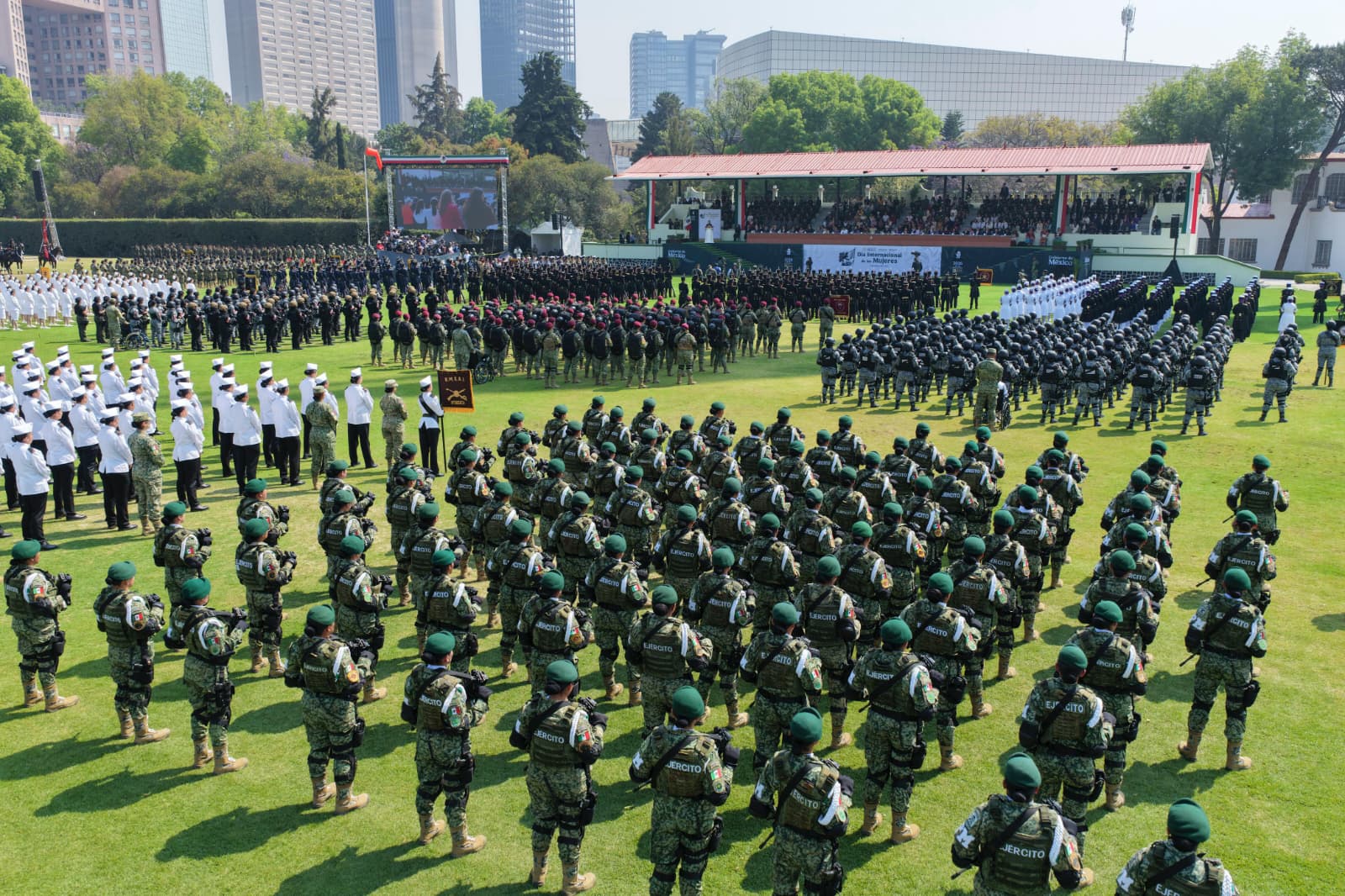 “Las mujeres de las Fuerzas Armadas. Mujeres del Ejército, de la Fuerza Aérea y de la Marina-Armada de México. Mujeres que portan con orgullo el uniforme. Mujeres que sirven a México con honor. Ustedes representan la continuidad de esa historia, de heroínas. Son parte de generaciones que han demostrado que el amor por la patria no tiene género, que el valor no tiene género y que el compromiso con México nace del corazón”, enfatizó.