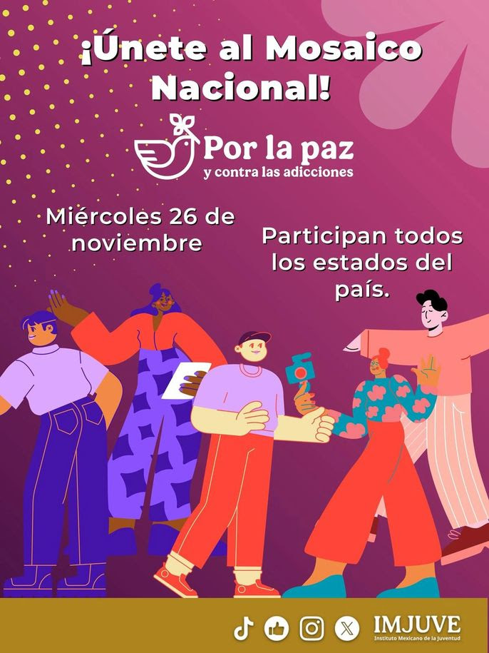 Ciudad de México, a 24 de noviembre de 2025.- Como parte de la Estrategia por la Paz y contra las Adicciones que impulsa la Presidenta Claudia Sheinbaum Pardo, el Instituto Mexicano de la Juventud (IMJUVE) anunció el “Mosaico Nacional por la Paz y contra las Adicciones”, una actividad que tiene el objetivo de reunir a miles de jóvenes de escuelas y comunidades de los 32 estados del país de manera virtual para enviar un mensaje de paz.