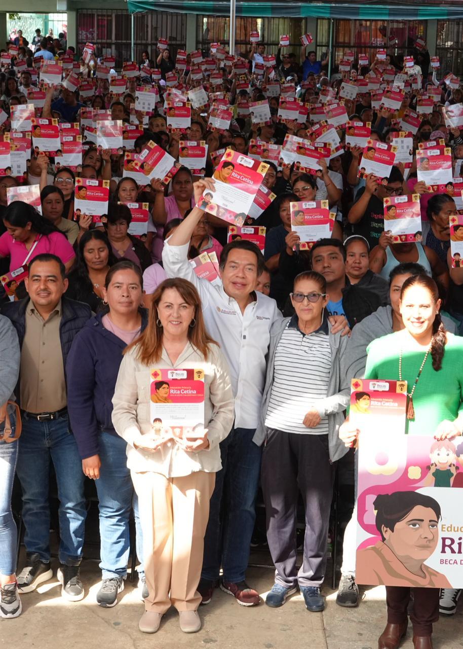 Acompañado por la GOBERNADORA de Morelos, Margarita González Saravia, el titular de la SEP detalló que actualmente 5.5 millones de estudiantes de secundaria ya cuentan con la Beca Rita Cetina con apoyos bimestrales, mientras que 4.5 millones de jóvenes de educación media superior reciben la Beca Benito Juárez.