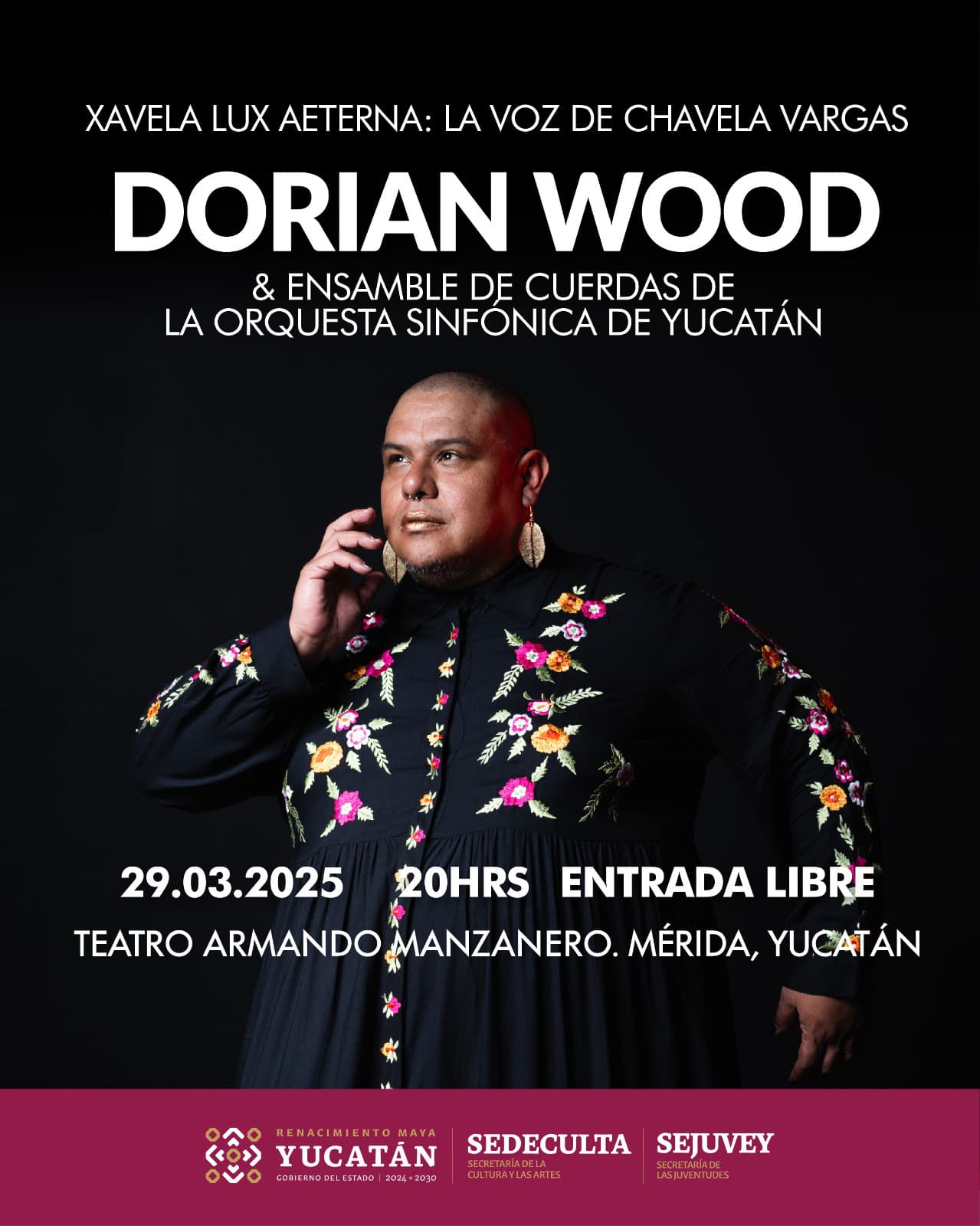 El cantante y artista multidisciplinario Dorian Wood se presentará el próximo sábado 29 de marzo en el Teatro Armando Manzanero con el espectáculo Xavela Luz Aeterna: la voz de Chavela Vargas , acompañado por un ensamble de cuerdas de la Orquesta Sinfónica de Yucatán.