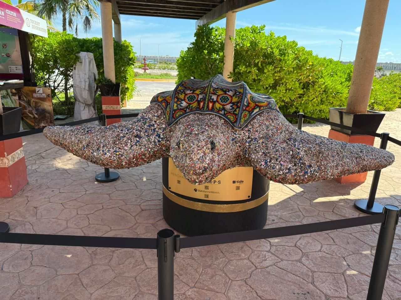 Progreso, Yucatán, 10 de septiembre de 2025.- La Terminal Internacional de Cruceros de Progreso exhibe desde esta semana “Tortuga: arte en el agua”, una escultura monumental del maestro César Menchaca, elaborada con plástico recolectado del mar e intervenida con chaquira de cristal bajo la técnica del arte wixárika.