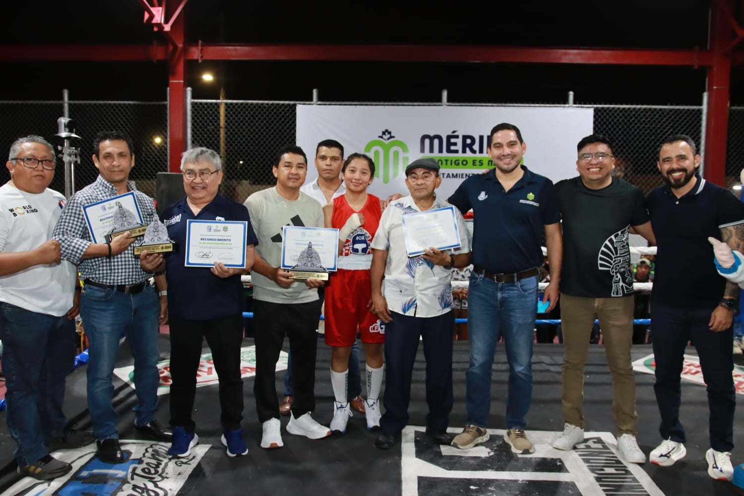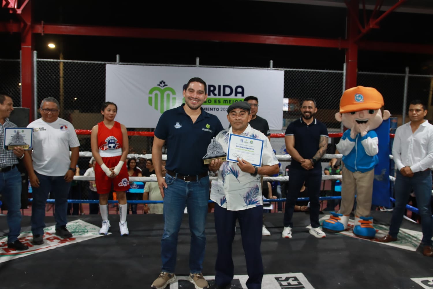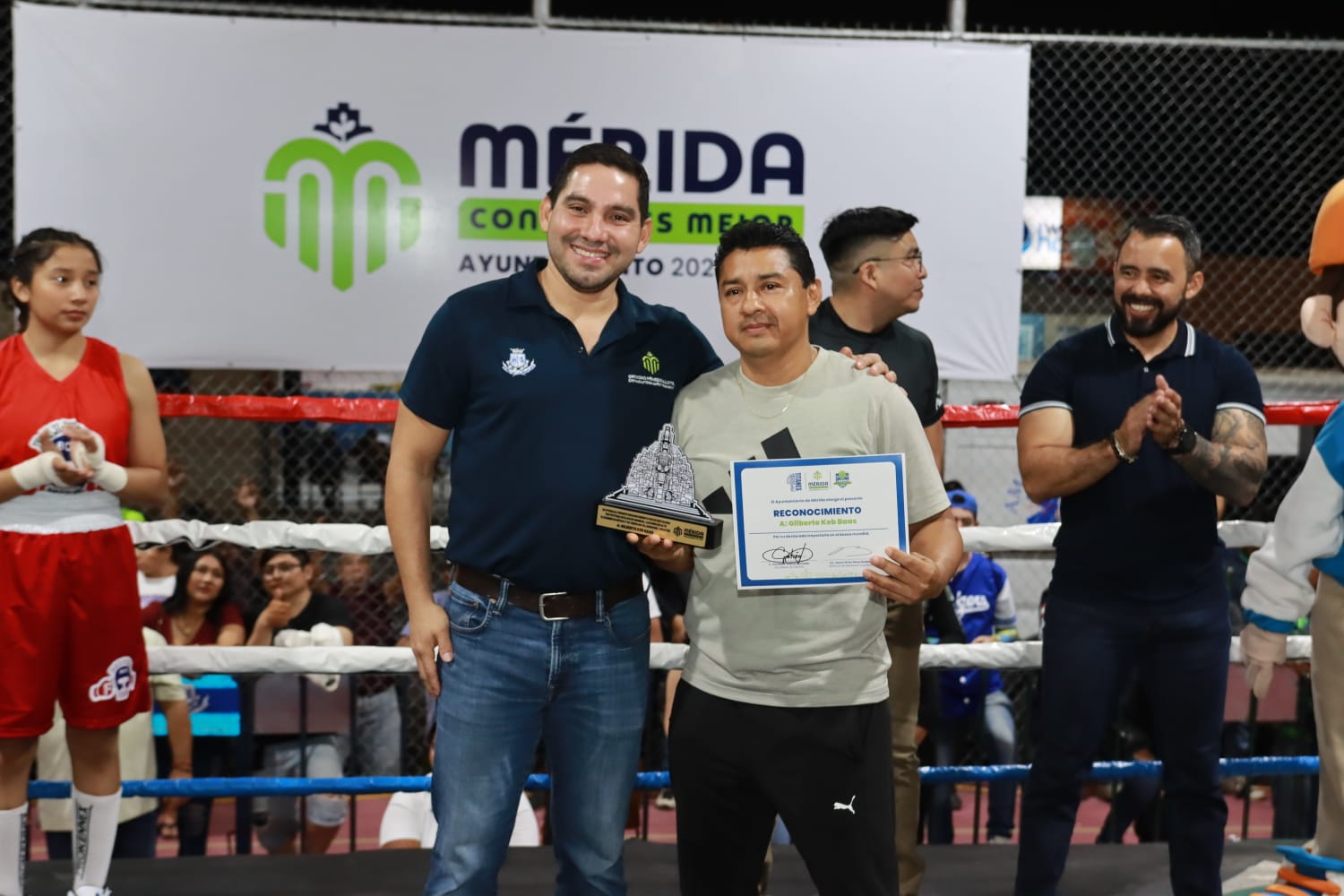 Mérida, Yucatán.– Con un lleno total en el graderío del parque de la colonia Azcorra, el Ayuntamiento de Mérida celebró la VI Fecha del “Torneo Municipal de Box” amateur, donde además se rindió un reconocimiento especial a ex campeones mundiales que han destacado en el ámbito internacional.
