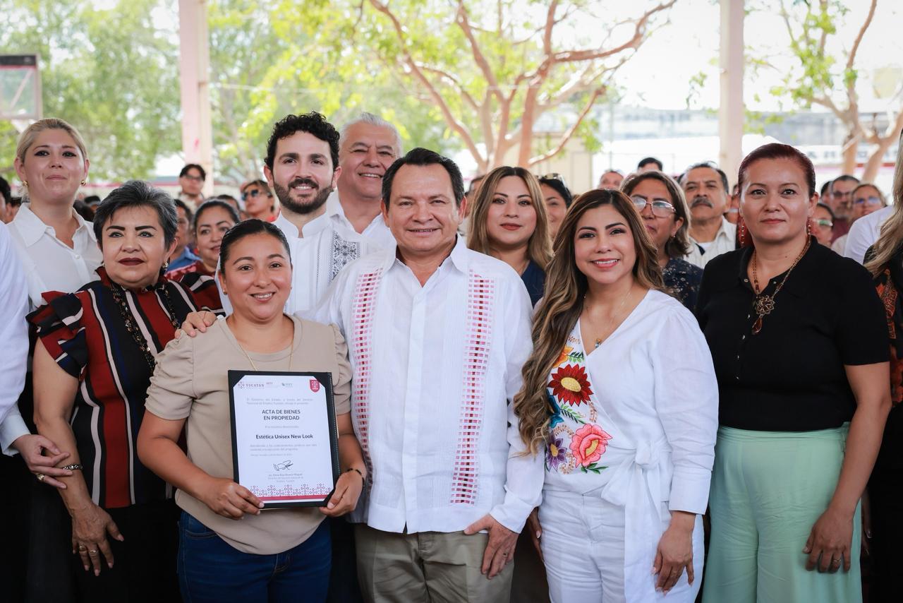 Durante el evento, el mandatario estatal estuvo acompañado por la Presidenta Honoraria del Sistema para el Desarrollo Integral de la Familia (DIF) Yucatán, Mtra. Wendy Méndez Naal, con quien realizó la entrega de apoyos que incluyen parrillas de gas, congeladores, herramientas para talleres, equipos para estéticas, básculas, sierras, esmeriladoras y diversos instrumentos de trabajo.