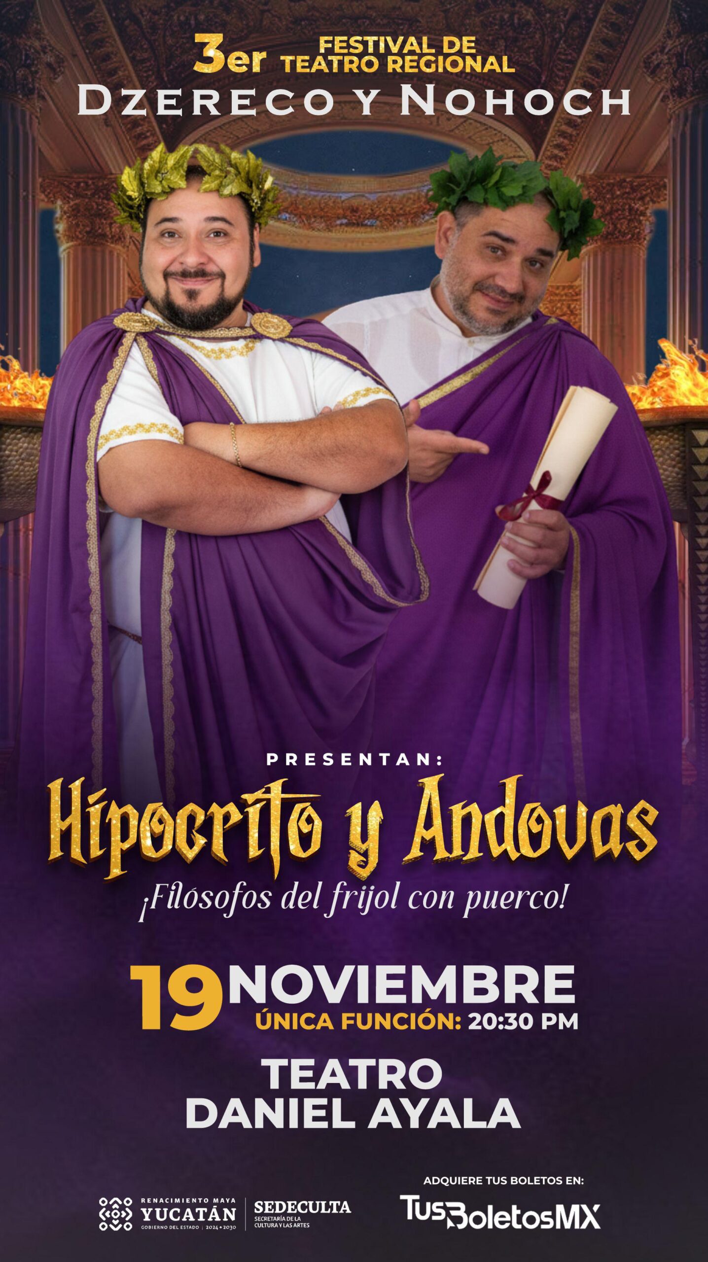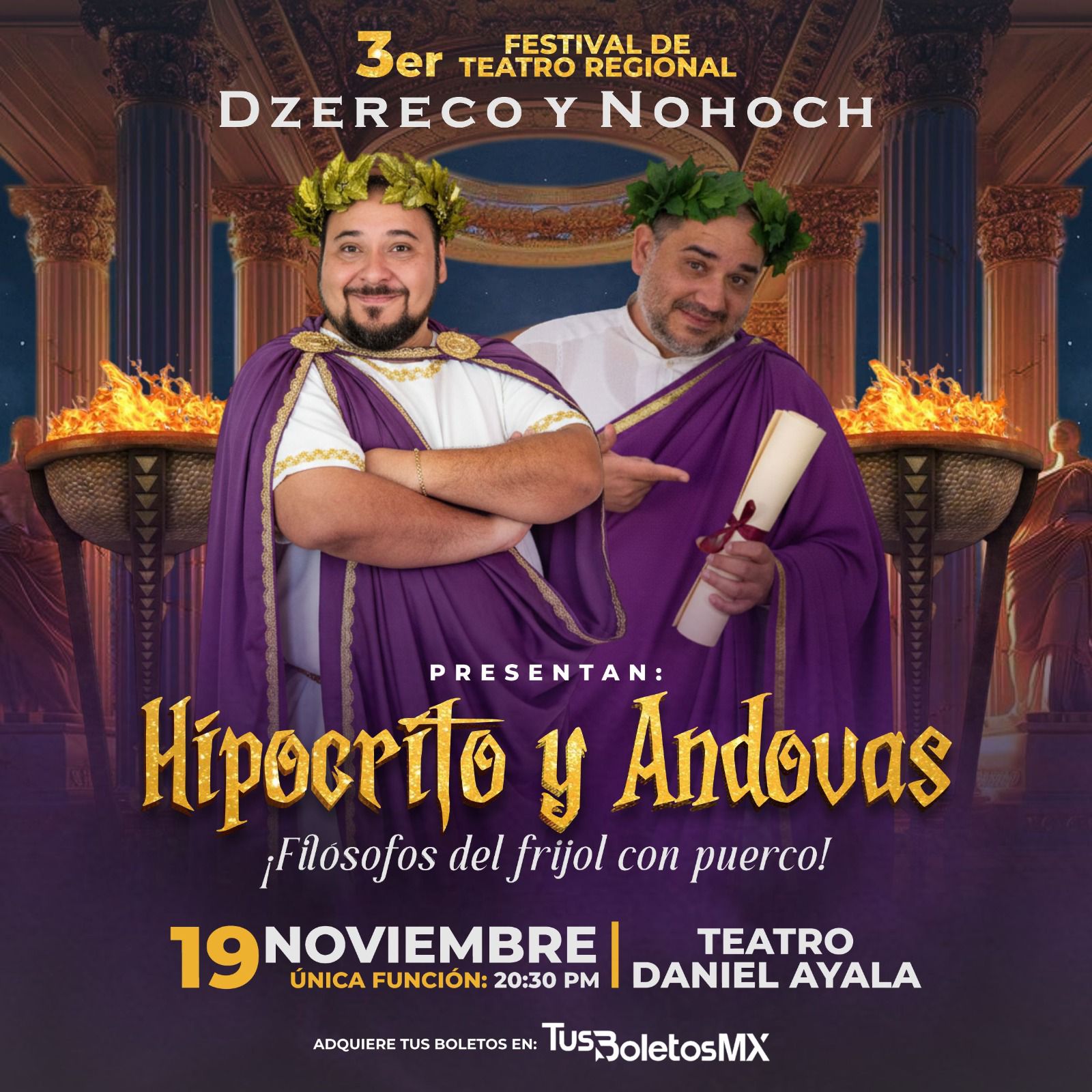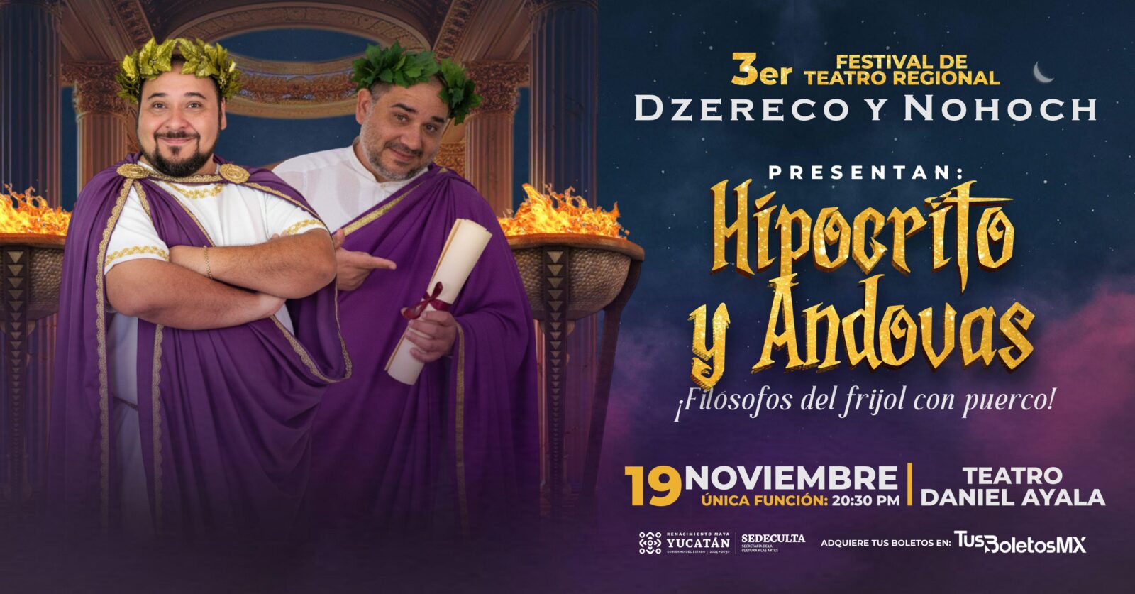 Mérida, Yucatán, 17 de noviembre de 2025. El telón del Tercer Festival del Teatro Regional se levantará este 19 de noviembre con el estreno de la puesta en escena “Hipócrito y Andovas… filósofos del frijol con puerco”, protagonizada por los hermanos Mario y Daniel Herrera, mejor conocidos como Dzereco y Nohoch, íconos del humor yucateco.