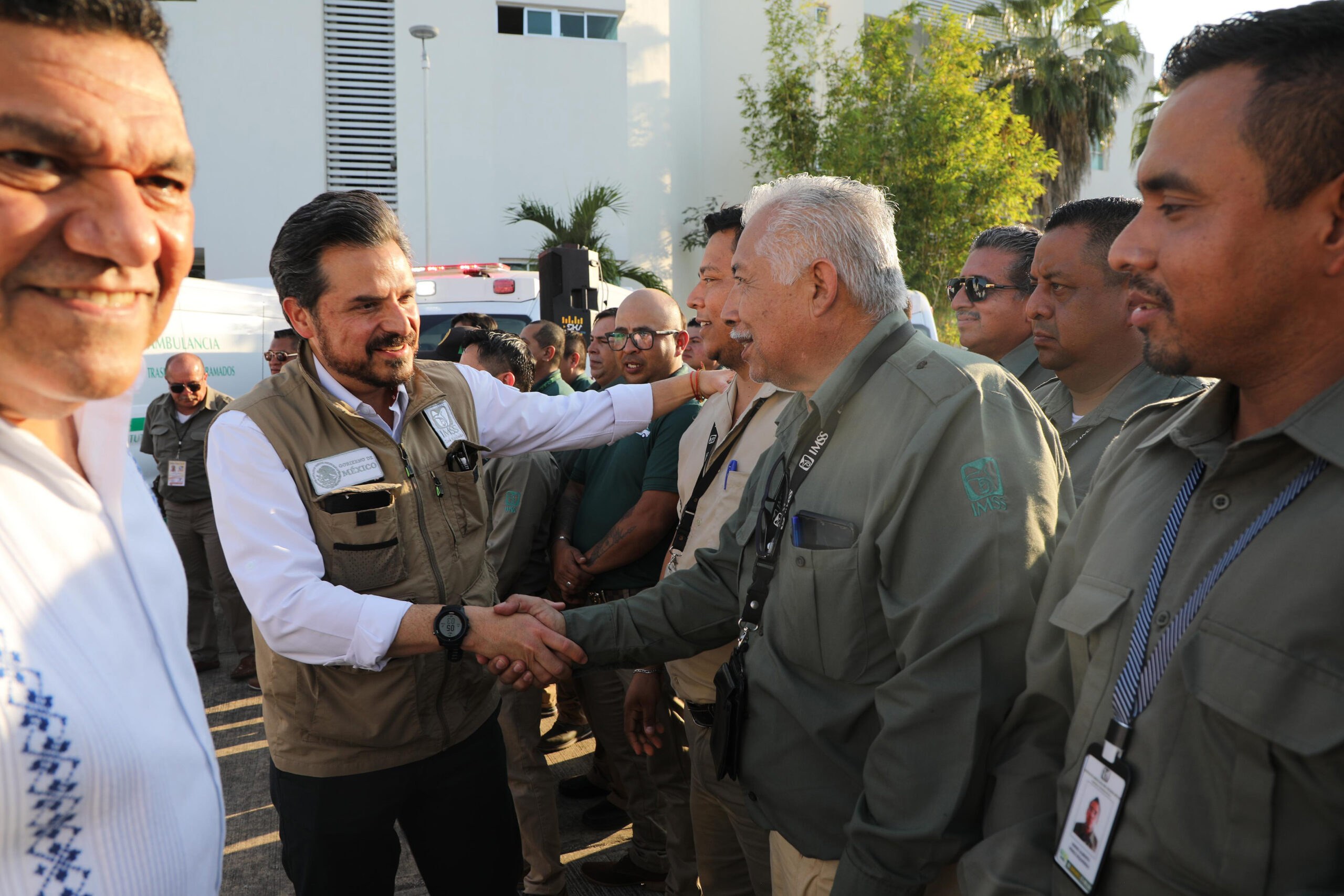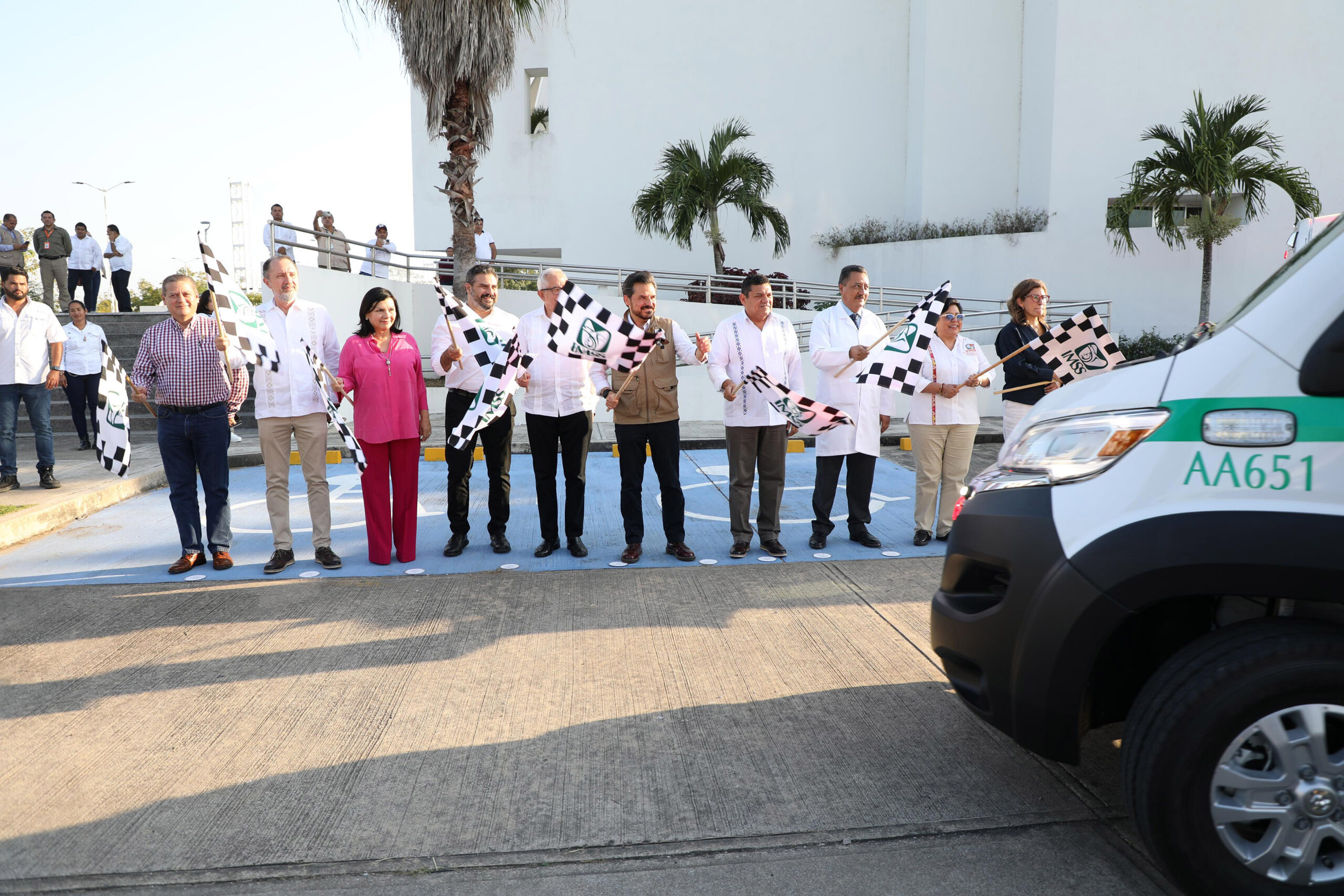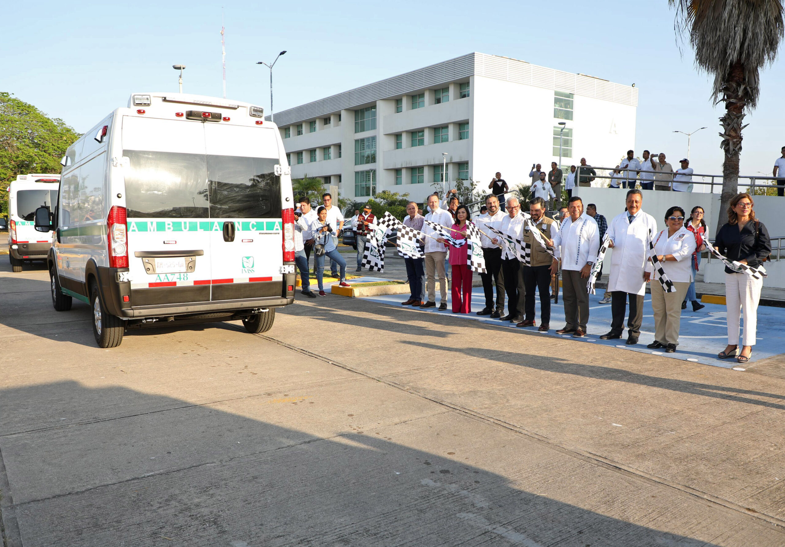 Previo al acto protocolario, el director general del IMSS y el gobernador de Tabasco dieron el banderazo de salida a 14 ambulancias para reforzar la atención en las unidades médicas de la entidad.
