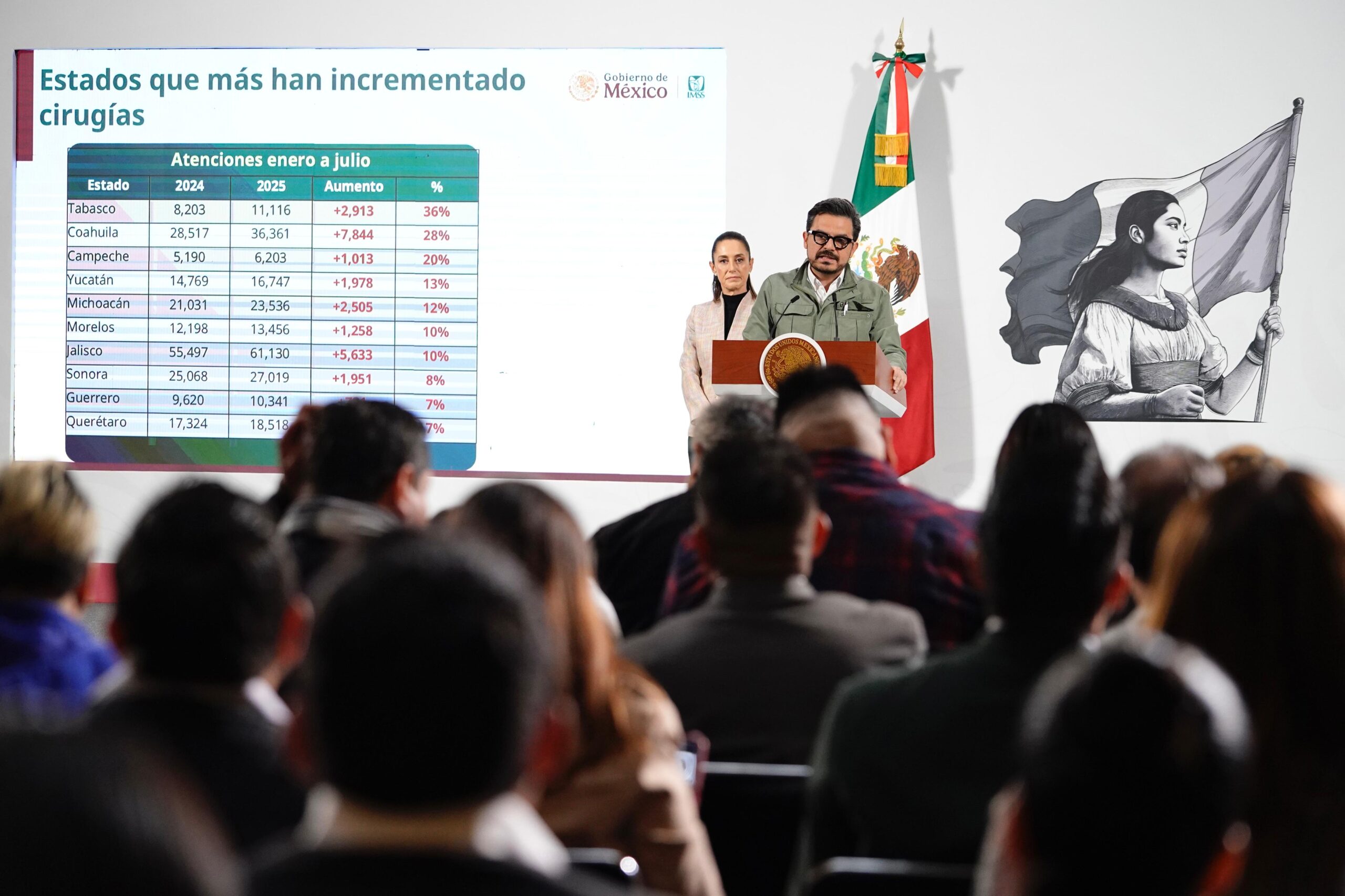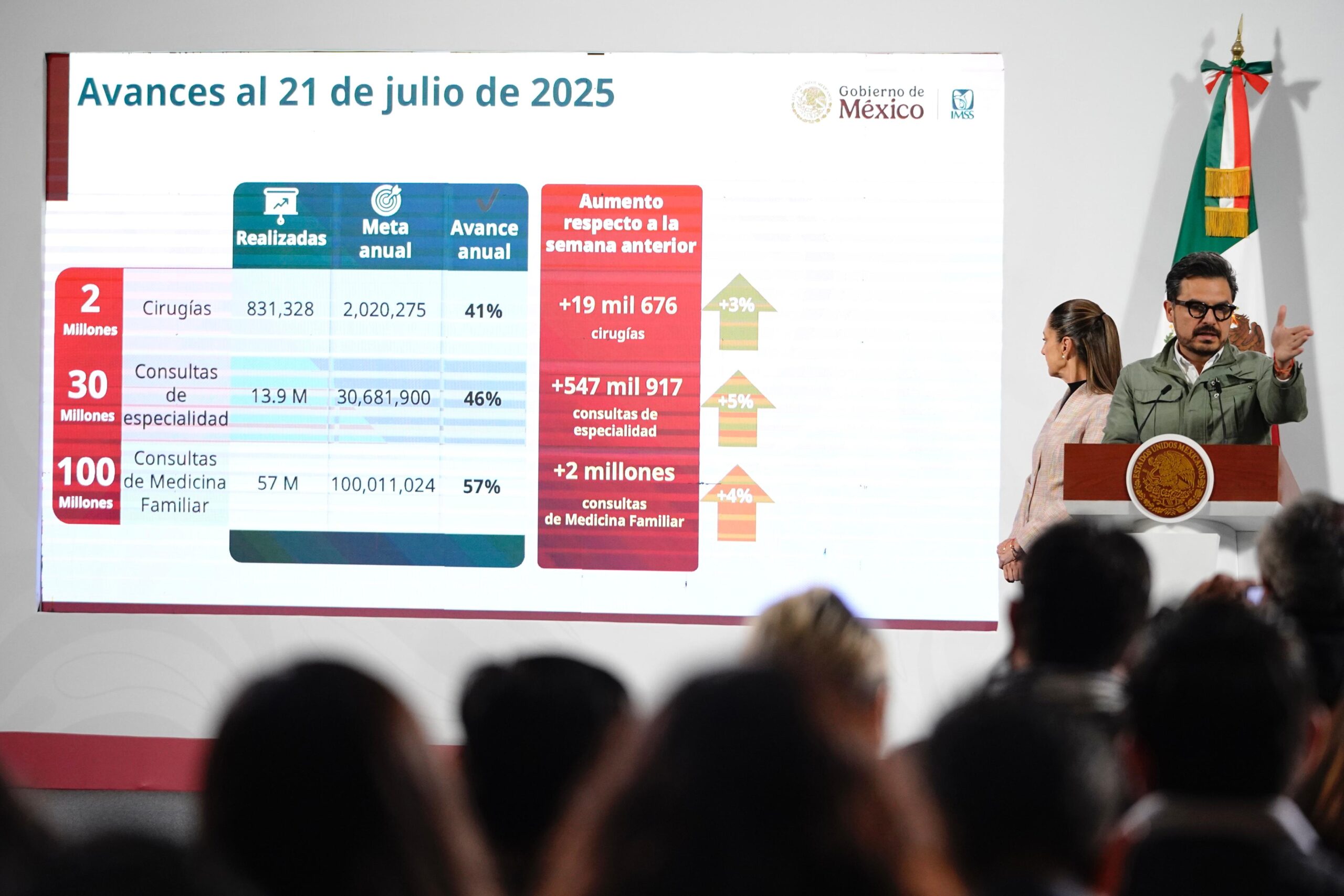 Comparado con el mismo periodo de 2024, estas cifras representan un crecimiento de 43 mil 308 cirugías más, 479 mil consultas de especialidad adicionales y 2.8 millones de consultas familiares extra.
