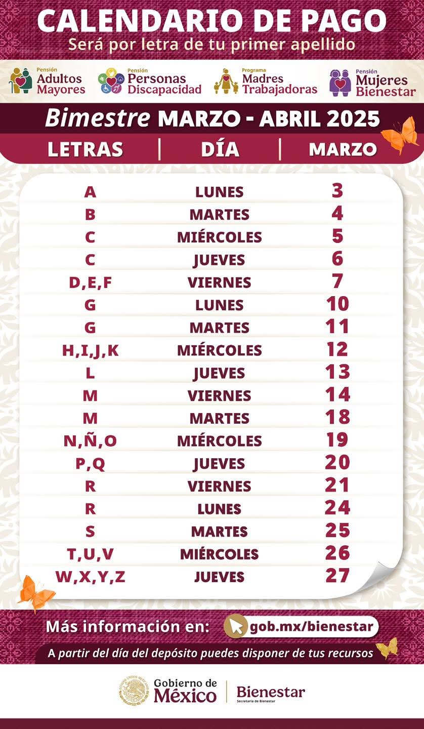 Tal como se anunció en la Conferencia Mañanera de la presidenta Claudia Sheinbaum Pardo, el calendario de pagos se distribuyó este día y contiene información sobre las fechas de cobro que le corresponden a cada apellido, como se menciona a continuación.