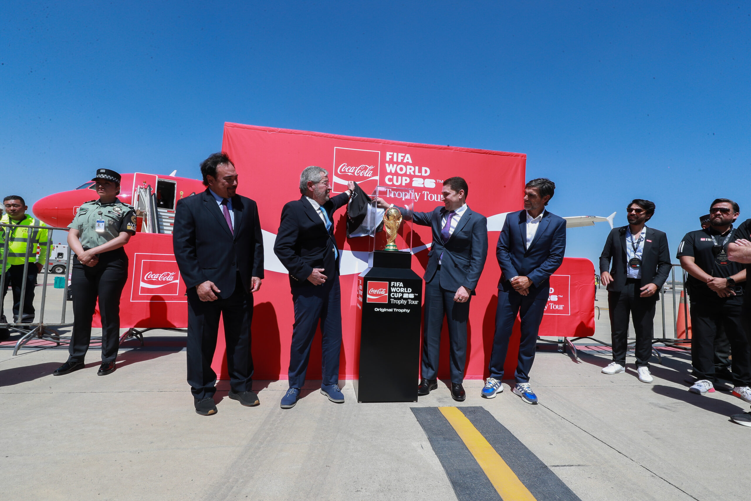 Durante la ceremonia de bienvenida participaron representantes de la FIFA, directivos de Coca-Cola México y el exfutbolista argentino Roberto Ayala, quien acompañará parte de la gira promocional.