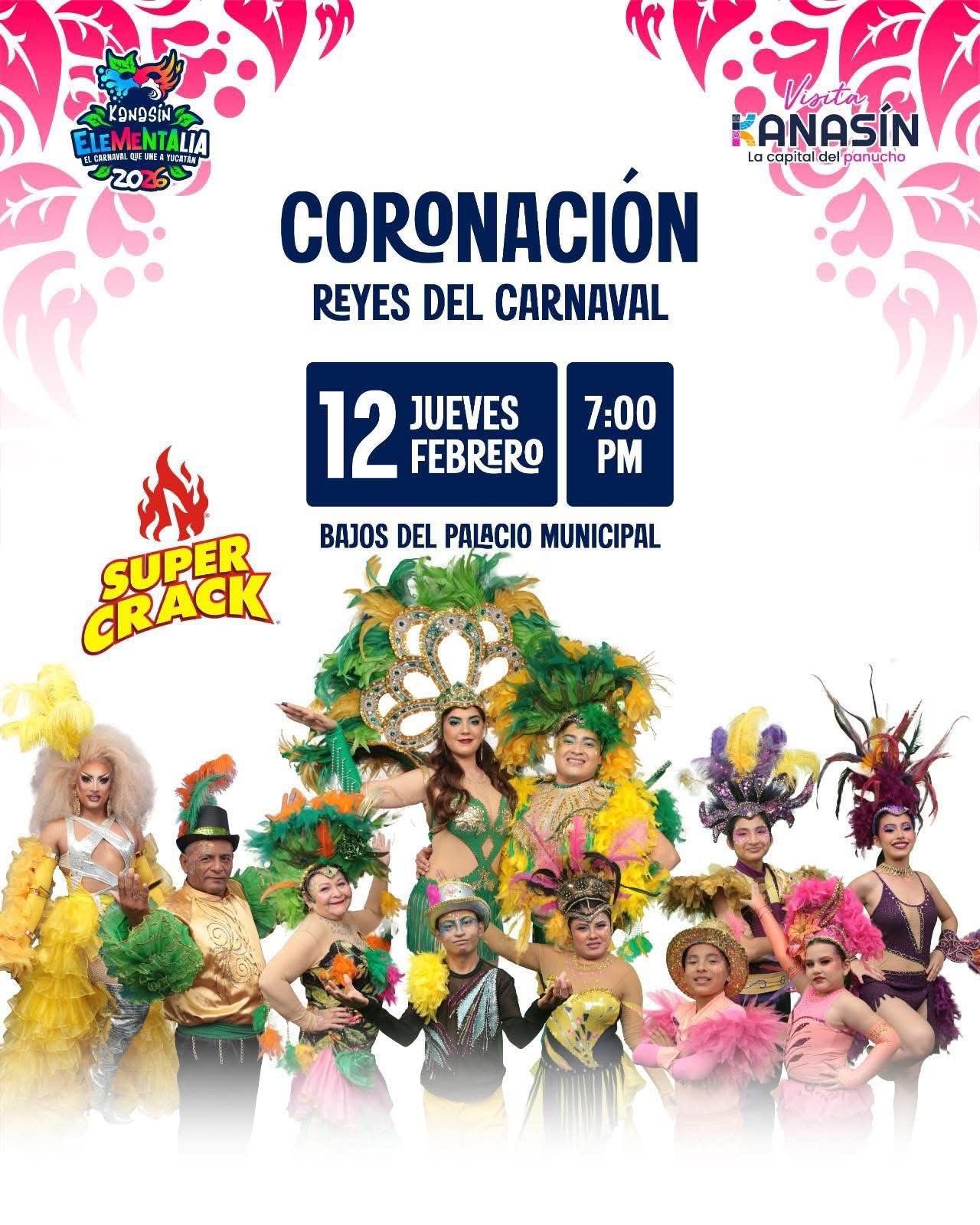 Uno de los eventos centrales será la coronación de los Reyes del Carnaval 2026, programada para el jueves 12 a las 19:00 horas en los bajos del Palacio Municipal. Serán coronados Nicte Ha I y Amauri I como Reyes Oficiales; Sofía I y Ángel I como Juveniles; Scarlett I y Rubén I como Infantiles; Kelly I y Lalito I como Reyes de la Discapacidad; Teresa I y Ramón I como representantes de los Adultos Mayores; y Dakota Drag I como Soberana de la Comunidad LGBT+.