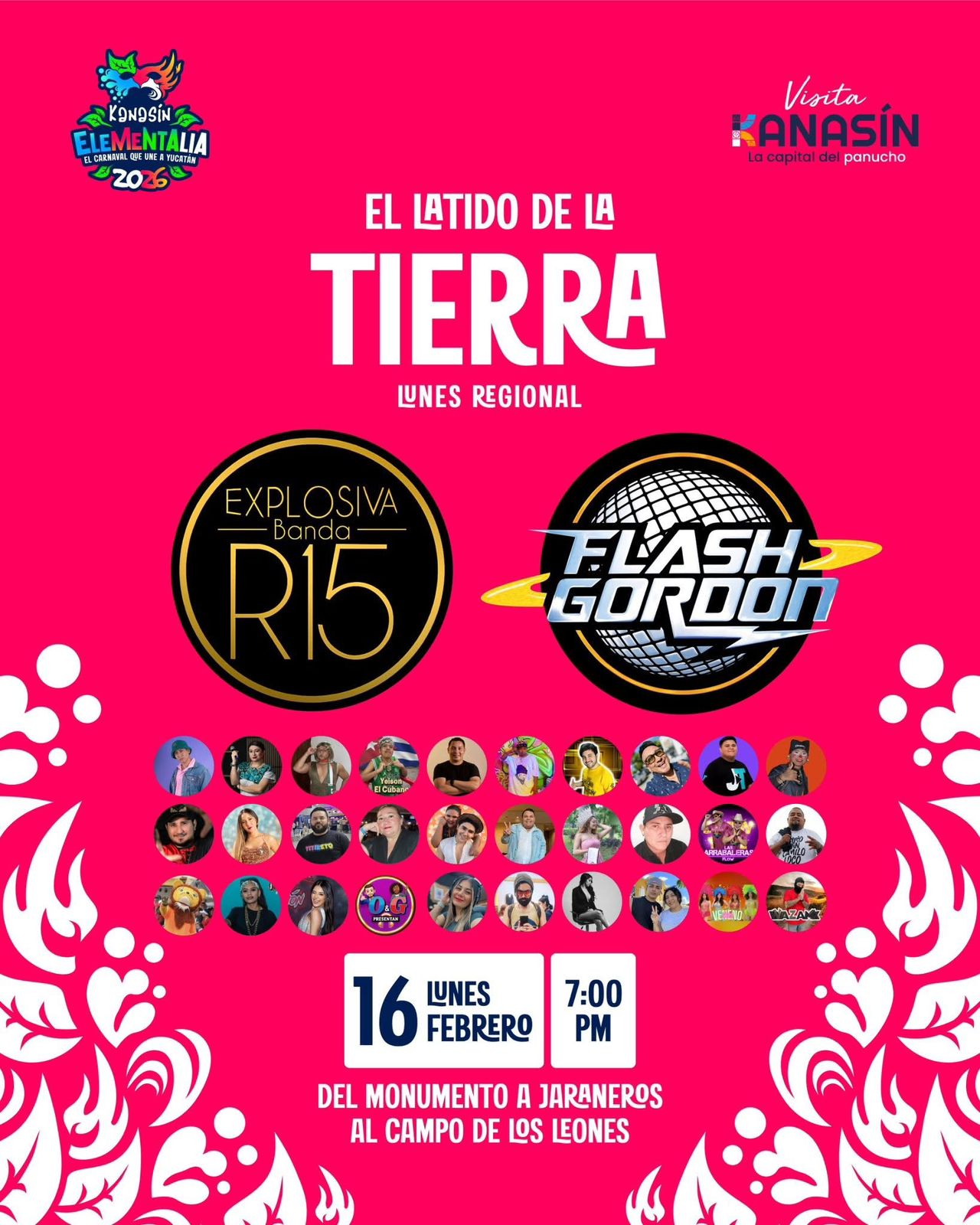 El lunes 16, durante el Lunes Regional, desfilarán influencers locales y nacionales desde el Monumento a los Jaraneros a las 19:00 horas, concluyendo en el campo de béisbol, donde se presentarán Explosiva Banda R15 y Flash Gordon.