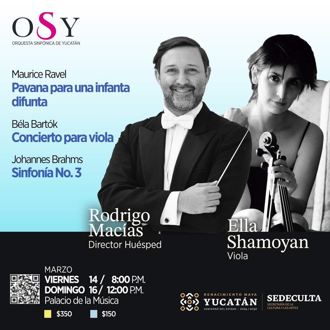 Mérida, 11 de marzo de 2025.- Con la interpretación de tres obras maestras de la música, entre ellas el Concierto para viola del compositor húngaro Bela Bartok, pieza exigente para virtuosos, con Ella Shamoyan como solista, la Orquesta Sinfónica de Yucatán presentará sendos recitales los días 14 y 16 de marzo en el Palacio de la Música de esta ciudad.