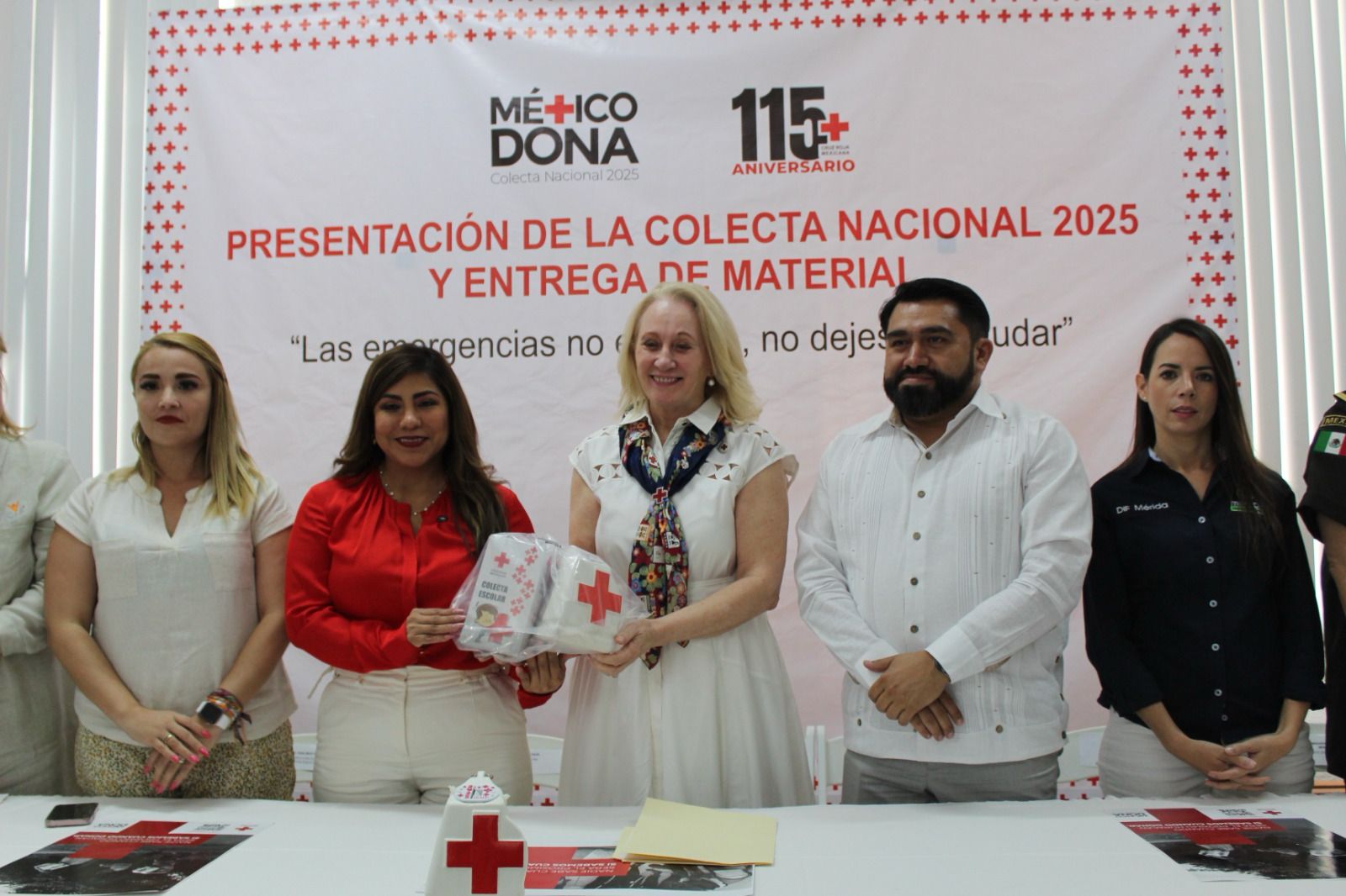 Mérida, Yucatán a 26 de marzo de 2025.- Con la entrega simbólica del material de la colecta estatal 2025 por parte de la Consejera Nacional y Delegada Estatal de Cruz Roja Mexicana en Yucatán, Michelle Byrne de Rodríguez a las autoridades estatales y municipales inicio la campaña para promover la donación a beneficio de la institución y continuar con la labor de salvar vidas.