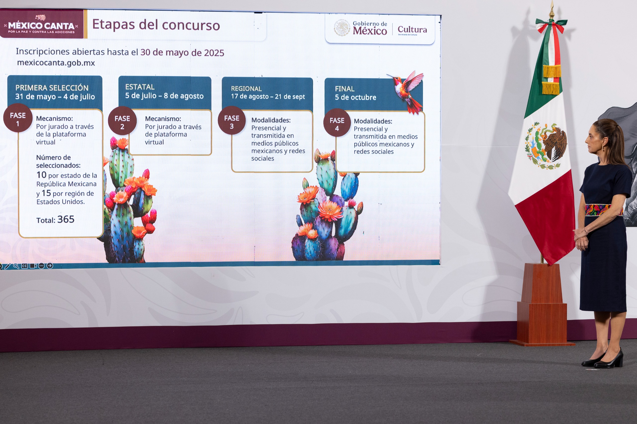 Ciudad de México, 23 de mayo de 2025. — Con más de 10 mil 415 jóvenes inscritos de México y Estados Unidos, continúa abierta la convocatoria al concurso musical México Canta por la Paz y Contra las Adicciones, impulsado por el Gobierno de México a través de la Secretaría de Cultura. Las inscripciones cierran el próximo 30 de mayo en el sitio oficial www.mexicocanta.gob.mx.