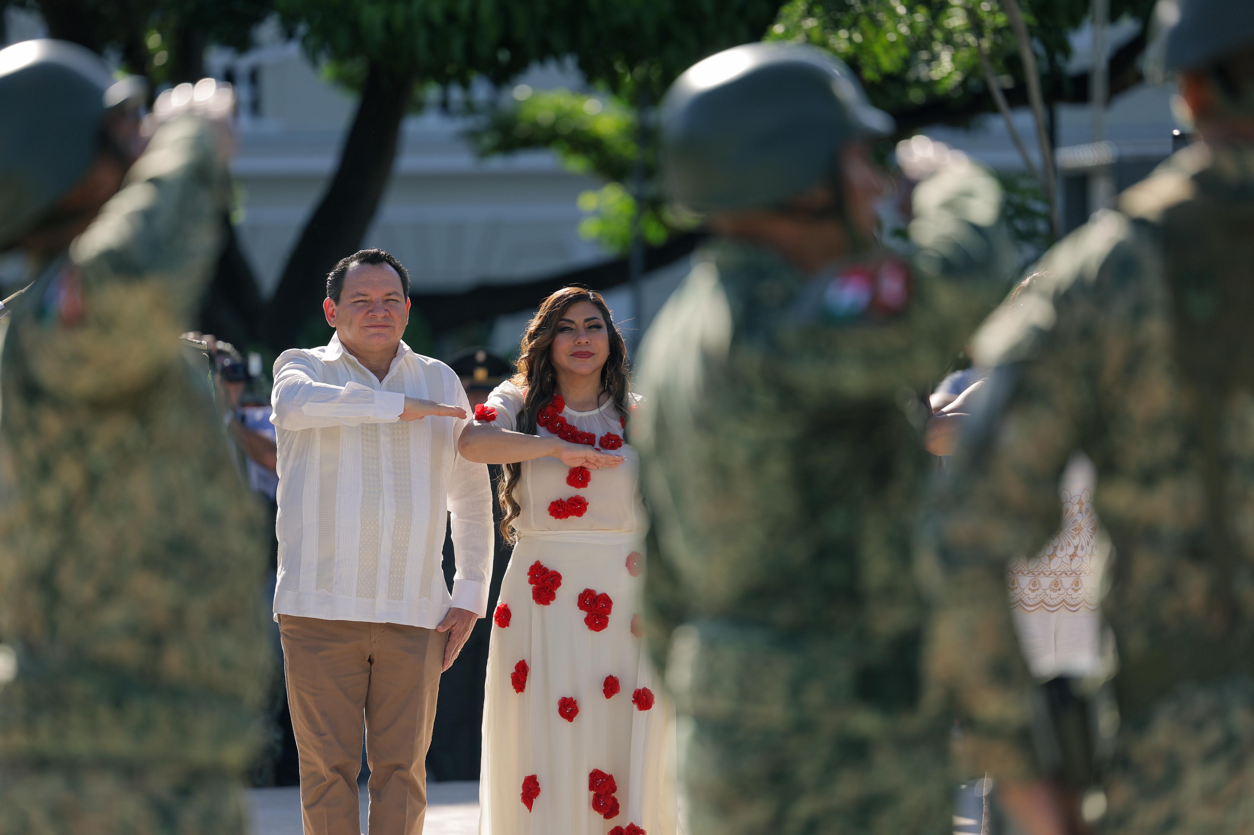 El Gobernador Joaquín Díaz Mena encabezó la ceremonia, acompañado de familias yucatecas que abarrotaron calles y plazas para presenciar el paso de instituciones educativas, cuerpos de seguridad y Fuerzas Armadas.