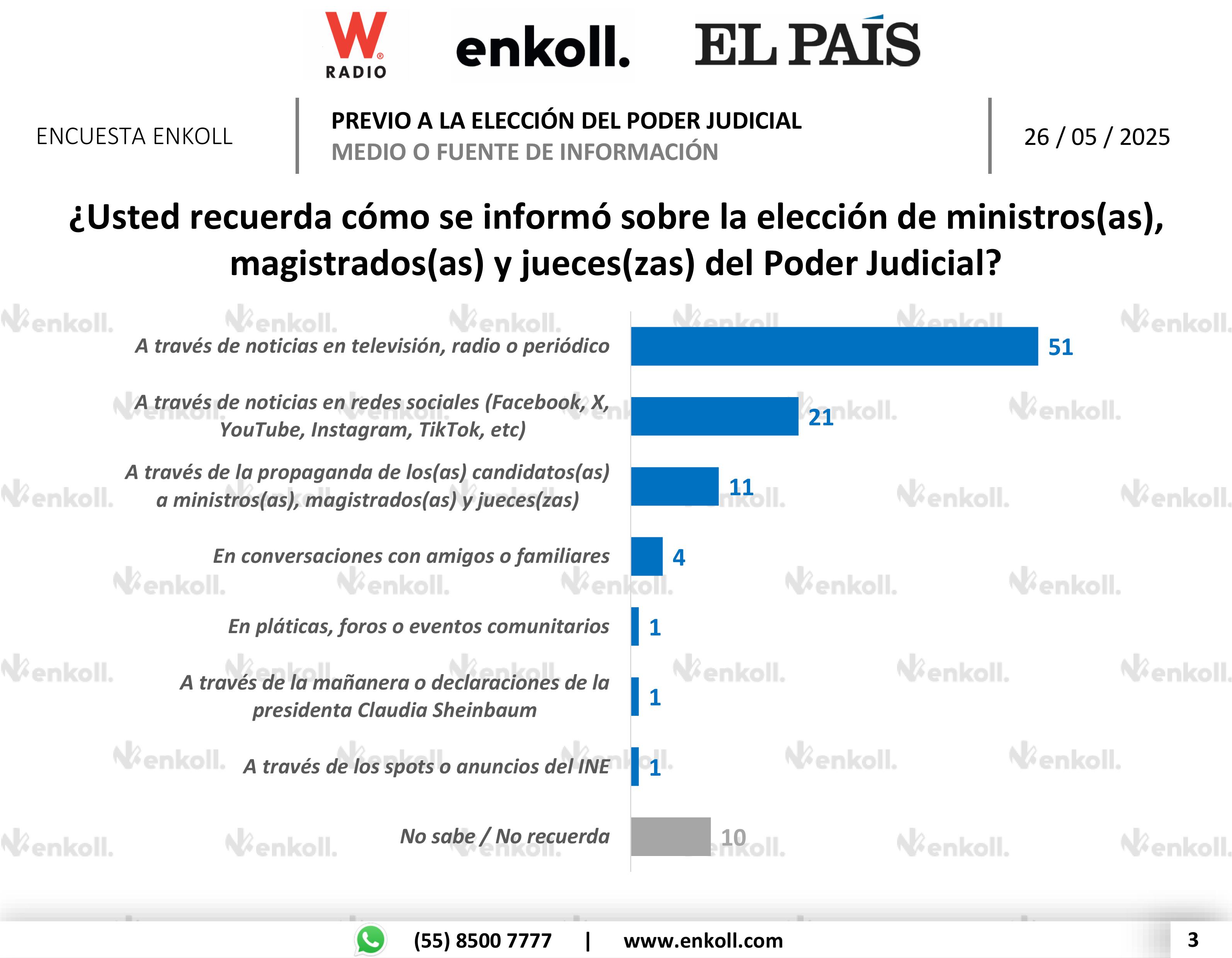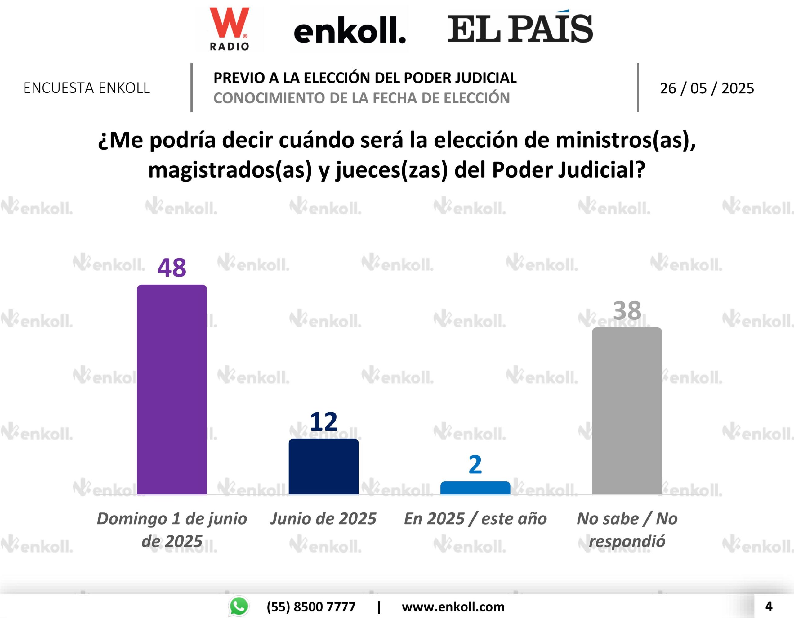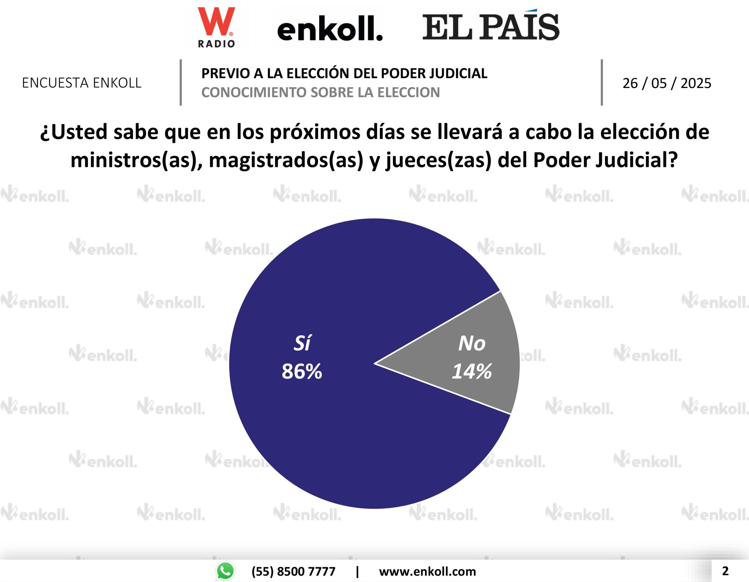 Ciudad de México, 26 de mayo de 2025.– La Presidenta de México, Claudia Sheinbaum Pardo, dio a conocer en su conferencia matutina los resultados de una encuesta publicada por el diario El País, elaborada por la casa encuestadora Enkoll, que refleja un amplio respaldo ciudadano a la reforma del Poder Judicial mediante elecciones.
