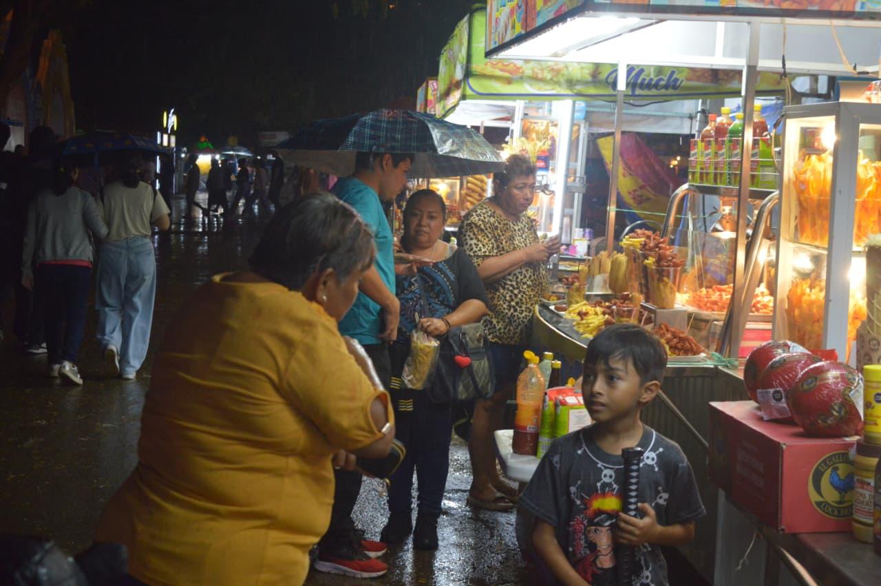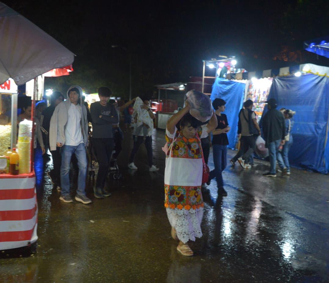 Tras un día de intensa afluencia y actividad, el cielo comenzó a tornarse oscuro apenas el sol se escondió en el poniente. Fue entonces cuando una lluvia ligera, fresca y casi ceremonial empezó a caer sobre el recinto ferial, como si Chaac hubiera llegado deliberadamente un día después del congestionado domingo para recorrer los pasillos con mayor tranquilidad.