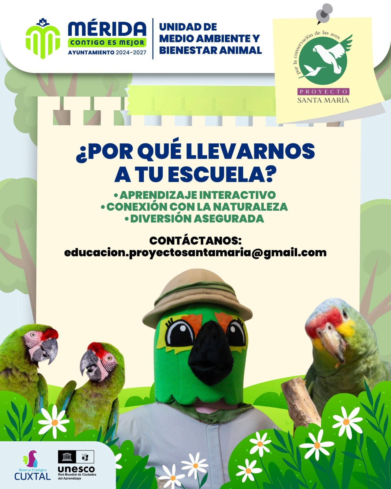 Mérida, Yucatán.– Luego del periodo vacacional, el Proyecto Santa María retomó sus pláticas y talleres en escuelas, con el objetivo de fomentar la protección y defensa de los loros, aves en grave riesgo en México cuya captura, venta y compra están prohibidas por ley.