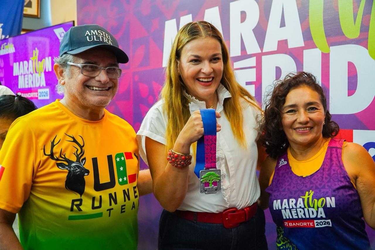 Mérida, Yucatán, jueves 23 de octubre de 2025.- La presidenta municipal de Mérida, Cecilia Patrón Laviada, encabezó la presentación oficial de la playera, medalla y ruta del Marat’hon Mérida Banorte 2026, competencia que se ha posicionado como una de las más importantes del sureste mexicano y que se realizará el próximo 4 de enero, con una bolsa de premios superior a 800 mil pesos.