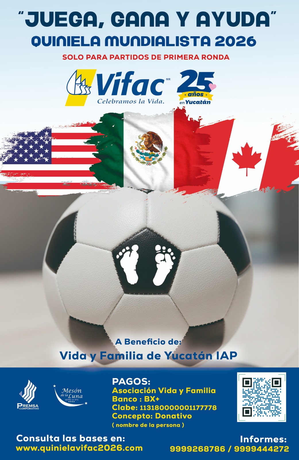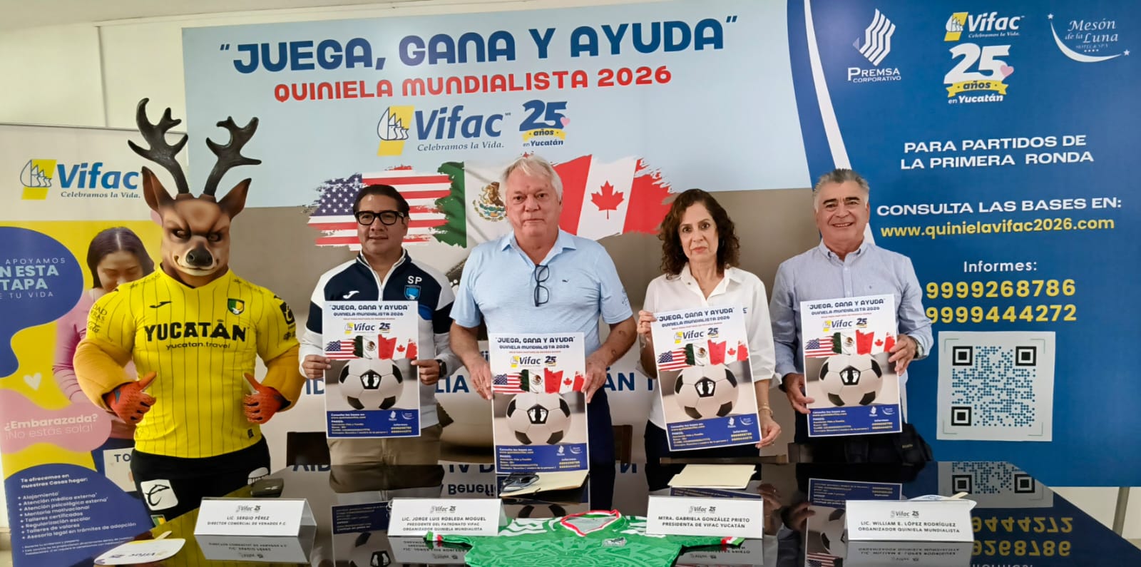 MÉRIDA, Yucatán, 19 de febrero.– Con el objetivo de recaudar fondos para apoyar la labor social de la organización Vida y Familia A.C. (Vifac), se realizó el lanzamiento oficial de la Quiniela Mundialista Vifac 2026, iniciativa que combina el entusiasmo deportivo con la solidaridad ciudadana.