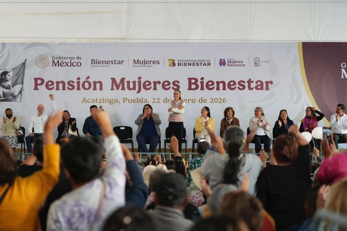 Acatzingo, Puebla, a 22 de enero de 2026.- Desde Acatzingo, Puebla, la Presidenta Claudia Sheinbaum Pardo encabezó la entrega de tarjetas del programa Pensión Mujeres Bienestar, que ya se otorga a 3 millones de mexicanas, en reconocimiento al trabajo que hacen por sus familias y que simboliza el cumplimiento al compromiso que hizo al asumir el Poder Ejecutivo Federal: “no llego sola, llegamos todas”.