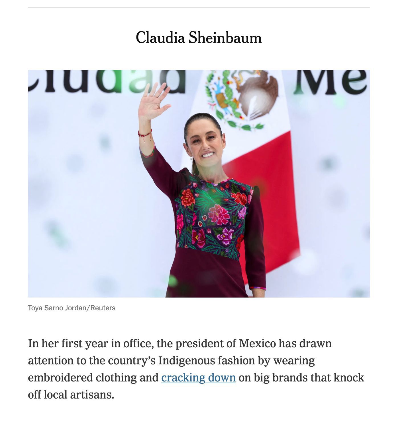 “En su primer año en el cargo, la presidenta de México ha llamado la atención sobre la moda indígena del país al usar ropa bordada y tomar medidas enérgicas contra las grandes marcas que imitan a los artesanos locales”, describen en el artículo.