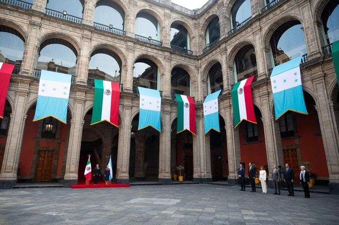 Como parte de la Ceremonia Oficial de Bienvenida, que se realizó en el Patio de Honor de Palacio Nacional, se entonaron los himnos nacionales de México y Honduras, posterior a ello, se realizó la toma de la fotografía oficial del encuentro.