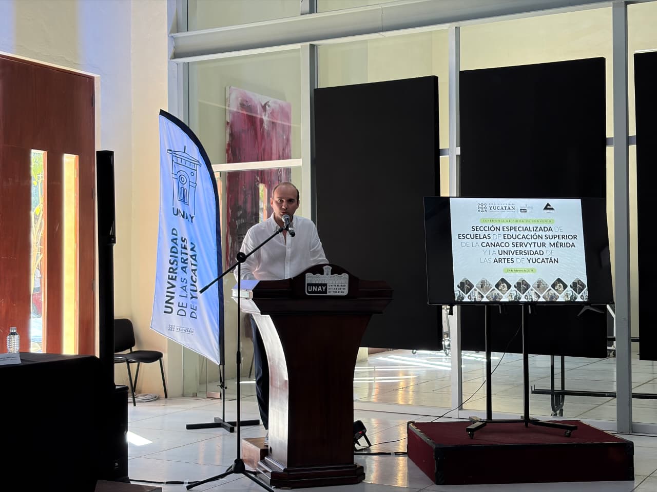 Mérida, Yucatán, 20 de febrero de 2026.— La Universidad de las Artes de Yucatán (UNAY) y la Sección Especializada de Escuelas de Educación Superior de la Cámara Nacional de Comercio, Servicios y Turismo de Mérida firmaron un convenio de colaboración orientado a fortalecer la formación académica, cultural y profesional de la comunidad estudiantil del estado.