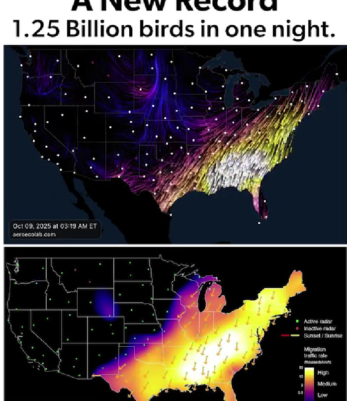El pasado 25 de septiembre se registró la primera Noche de los Mil Millones de Pájaros de 2025, con 1,200 millones de aves migrando hacia el sur. Antes de estos dos eventos, la marca solo se había alcanzado una vez en dos décadas de monitoreos, en octubre de 2023.