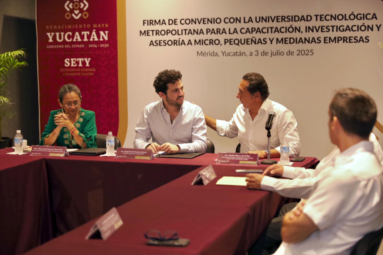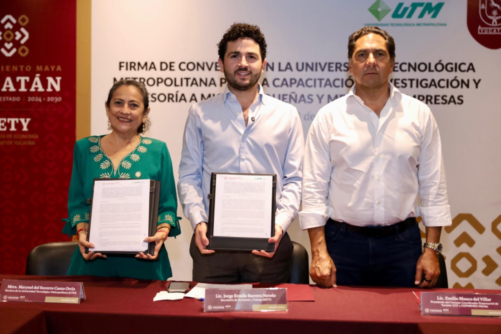 Mérida, Yucatán, 4 de julio de 2025.– Con el propósito de fortalecer a las micro, pequeñas y medianas empresas (MiPyMEs) a través del conocimiento, la innovación y la formación especializada, la Secretaría de Economía y Trabajo (SETY) y la Universidad Tecnológica Metropolitana (UTM) firmaron un convenio de colaboración que busca transformar el panorama empresarial de Yucatán.