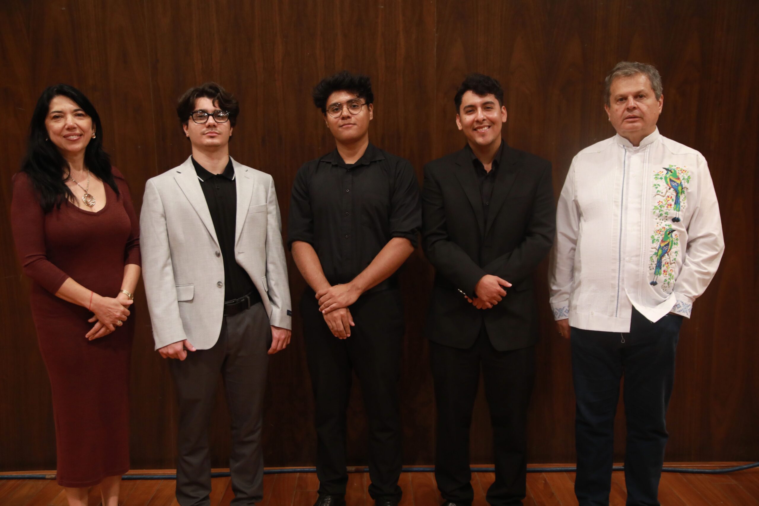 La maestra Irina Decheva y el director invitado Marcelletti Jr. presentaron a los tres jóvenes talentos, seleccionados entre 40 pianistas provenientes de México y nueve países latinoamericanos, quienes destacan por sus estudios avanzados, trayectoria internacional y formación con maestros de renombre.