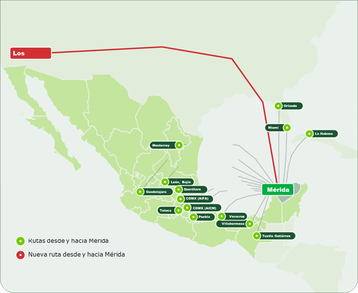 En el siguiente mapa se muestran los destinos que Viva ofrece desde Mérida:
