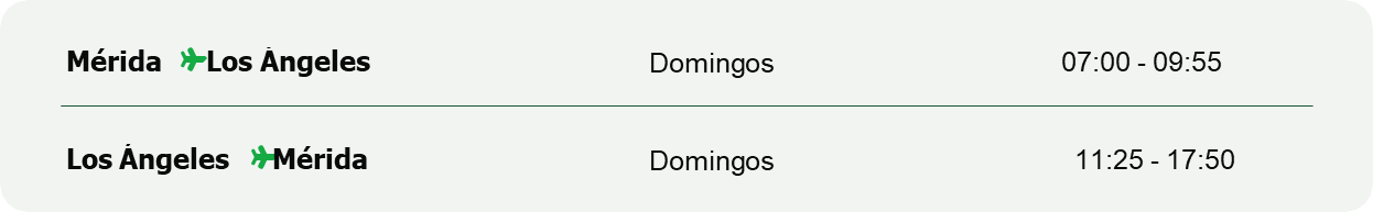 La ruta estará operando durante esta alta temporada vacacional de fin de año con una frecuencia semanal los domingos desde el 14 de diciembre hasta el 11 de enero. Es muy importante recordar que, durante el último semestre de 2026, la ruta regresará de forma permanente para ofrecerle a los pasajeros yucatecos un destino internacional más al que podrán volar durante todo el año.