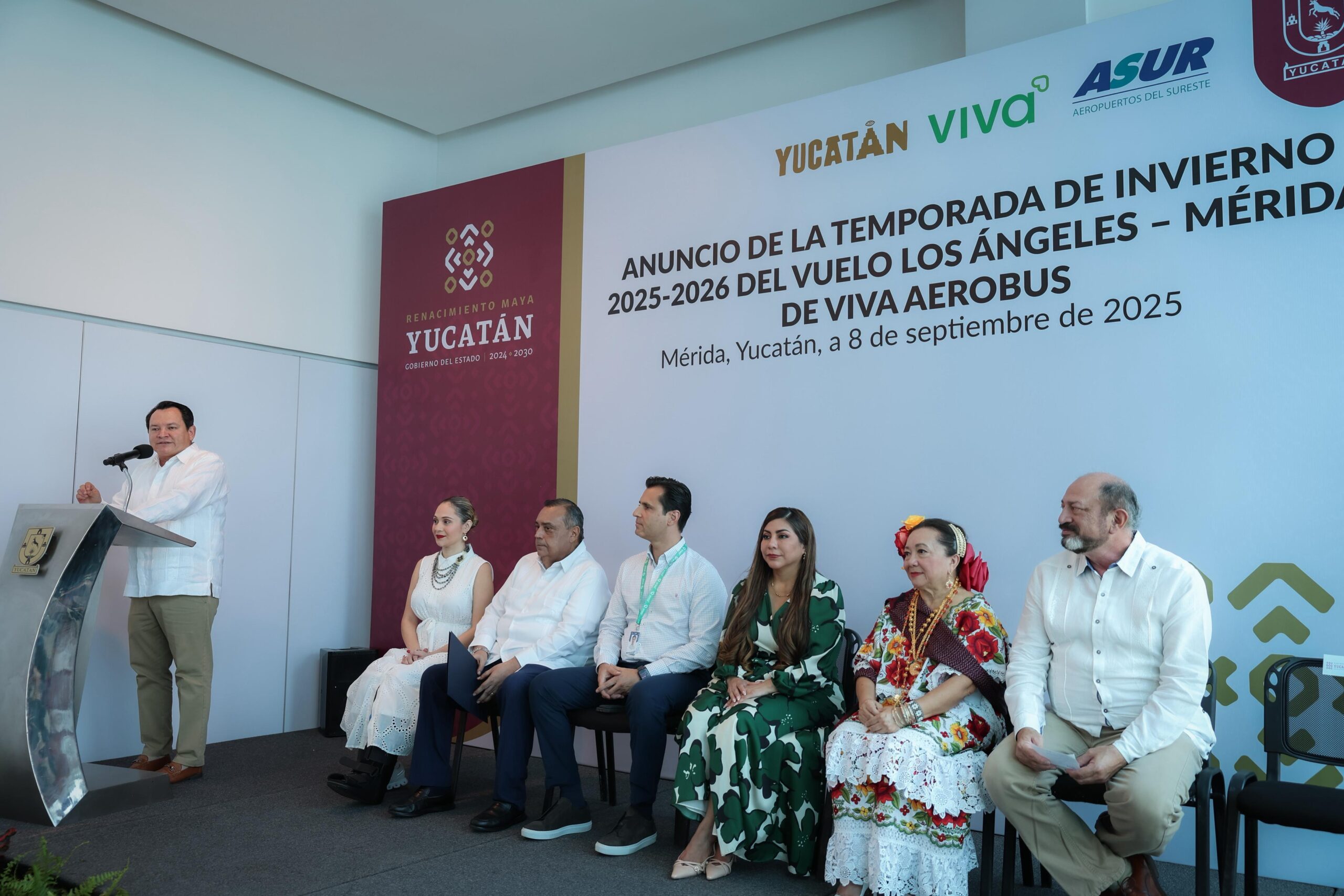 El mandatario explicó que la nueva conexión con Los Ángeles se convertirá en un puente entre California y Yucatán, fortaleciendo lazos culturales, atrayendo turismo y generando nuevas oportunidades de inversión. Además, resaltó la estrategia de promoción “Santuario Maya”, que posiciona al estado como un destino arqueológico, gastronómico y natural.