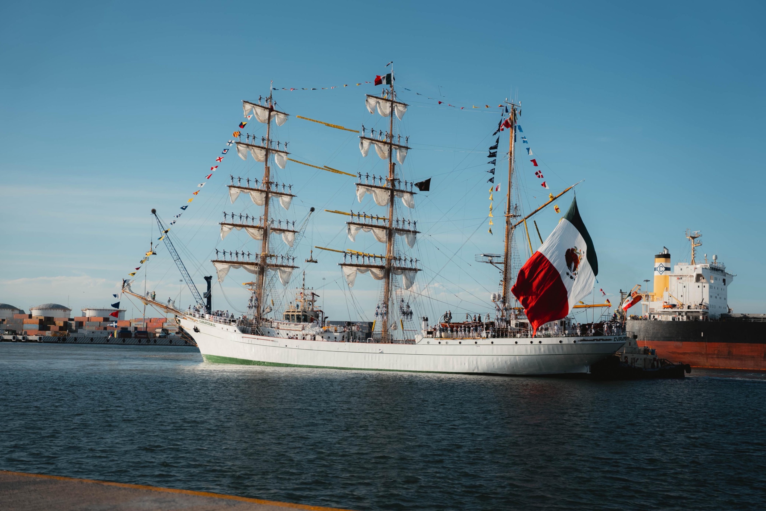 El emblemático velero atracó a las 16:30 horas en la terminal de cruceros, recibido entre aplausos, música de jarana y la admiración del público. Su tripulación está conformada por 166 cadetes de la Heroica Escuela Naval Militar, quienes compartirán durante su estancia los valores de disciplina, honor y servicio que distinguen a la Armada de México.